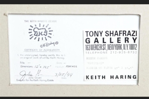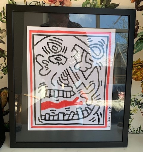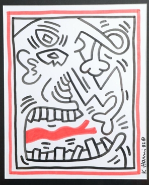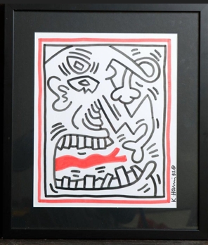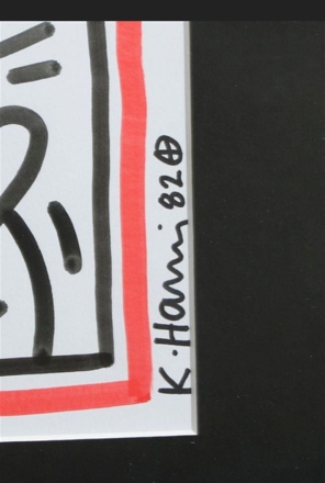 Prachtige tekening gemaakt door Keith Haring in 1987. Werk is gemaakt met zwart en rode viltstift. Aan de achterzijde gestempeld/certificaat en label van Tony Shafrazi Gallery. De Gallery waar Keith Haring vaak exposeerde.