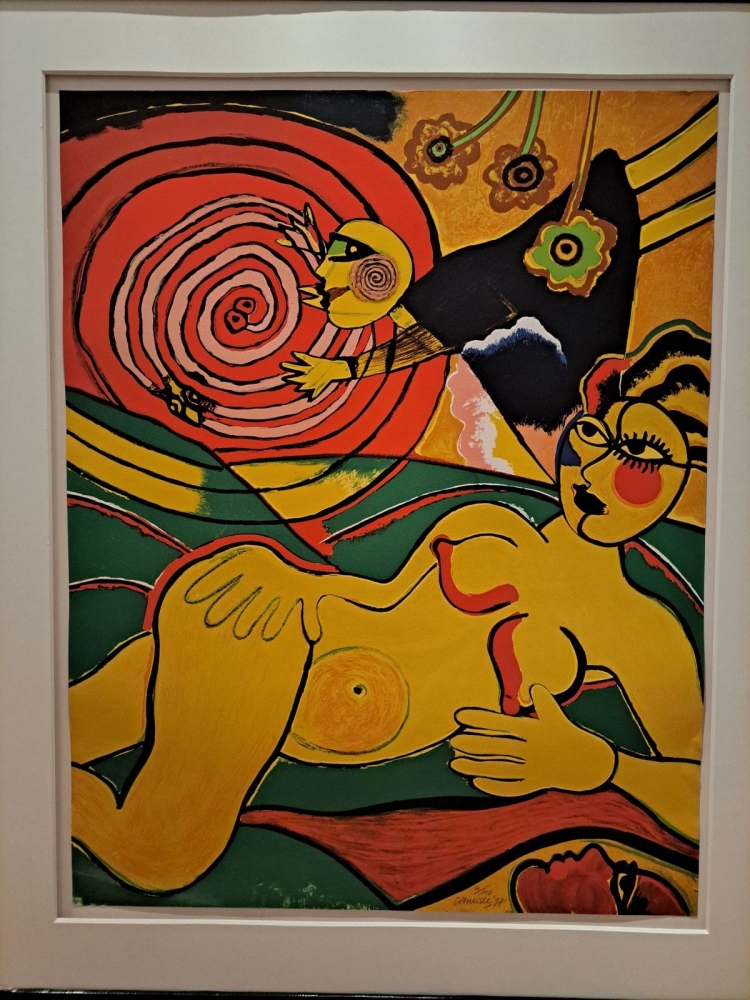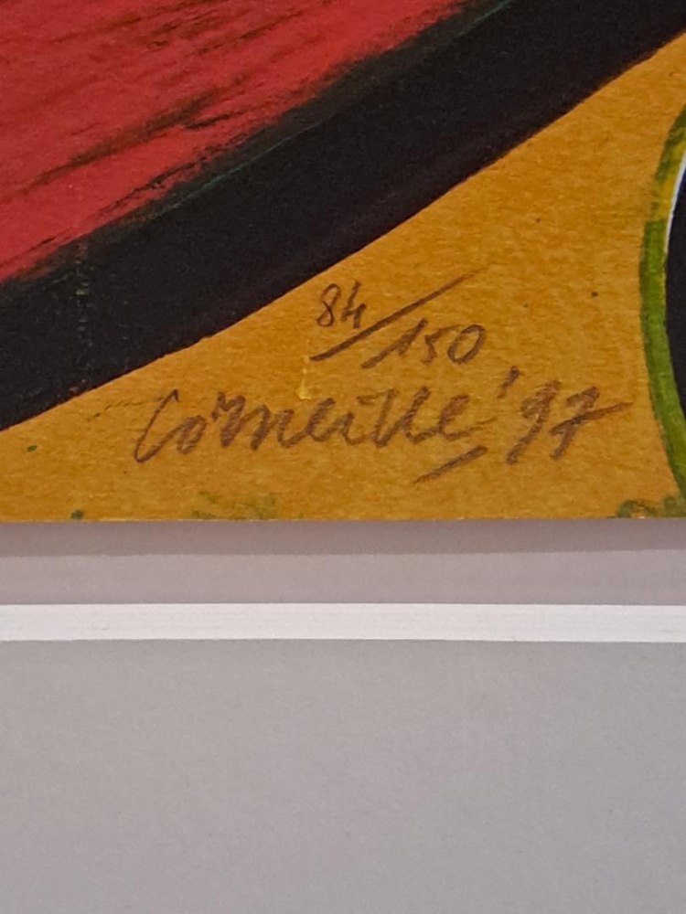 zeer grote kleurrijke zeefdruk "L'enchantement du solei.l serpent" van Guillaume Corneille, uitgegeven door GKM Zweden in 1997 op 150 exemplaren. dit is het nummer 84 momenteel zwevend ingelijst in passepartout (in zwarte kader zonder glas) maar dit werk verdient een nieuwe kader hetgeen de lage instelprijs verklaart.