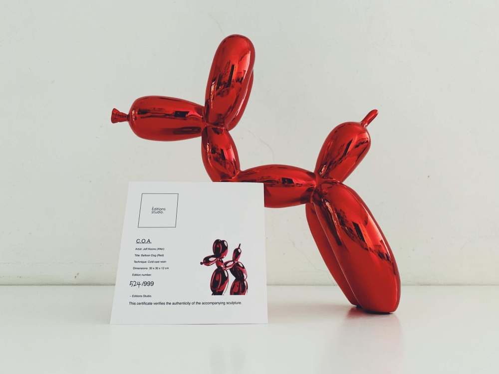 Balloon Dog Jeff Koons Editions Studio- Is gemaakt in oplage van 999- Inclusief certificaat, nummering en originele doos- Editions Studio- Afmetingen : 30x30x12cm- Nummering: /999 Jeff koons Balloon dog (after) Red