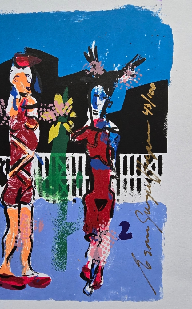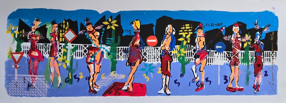 Zeefdruk van Espen Hagen - Bar Ladies Afmeting blad: 49 x 136 cm. Gesigneerd: Hand gesigneerd met Marker Oplage: 100 ex. Het oplagenummer op de foto kan afwijken van het verkochte. Als wij meerdere exemplaren hebben in gelijke conditie maken wij niet voor elk blad een nieuwe foto. Verzending goed verpakt in koker en aangetekend/verzekerd