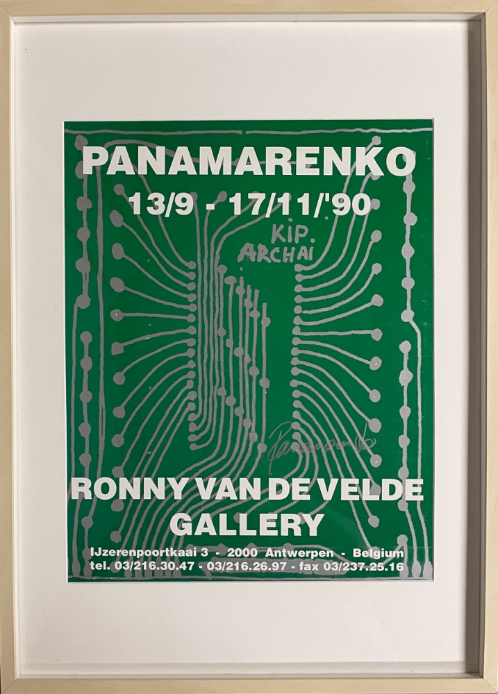 Panamarenko Kunstenaarsposter, solotentoonstelling Antwerpen, 1990, Fotolitho met zilverinkt op (zijdeglanzend) kunstpapier, Afmetingen: 50 x 50 cm, Getekend ondertekend, Uitstekende staat, Niet ingelijst Panamarenko werd in 1940 geboren in Antwerpen, waar hij woonde en werkte. Hij wordt beschouwd als 1 van de belangrijkste Belgische kunstenaars en had meerdere grote solotentoonstellingen over de hele wereld. Ronny Van de Velde was zijn Antwerpse galeriehouder en de vader van de huidige Sofie Van de Velde Gallery.