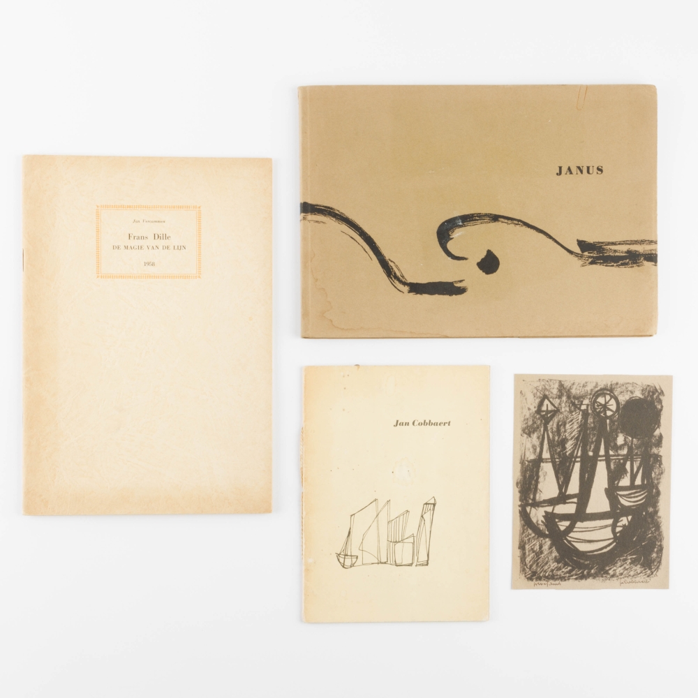 Jan Cobbaert - S.l.n.d. (1952). Plakket. Een van de 100 ex., nr. 97. Met originele lithografie, getekend en genummerd in potlood. Bijgevoegd: Proefdruk van de litho. Getekend en met annotatie. Met signatuur op eerste pagina Hubert Lampo. En: Frans Dille - twee publicaties van/ over de kunstenaar.