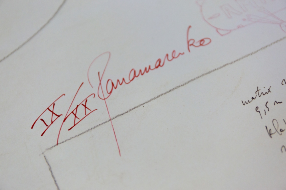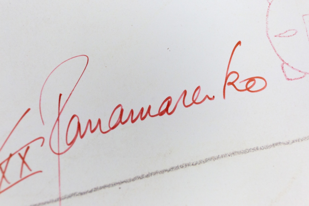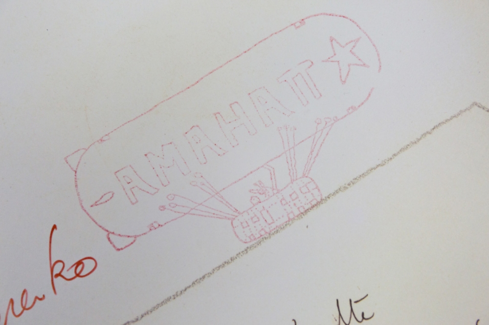 Zeefdruk en offsetdruk met stempel op karton van Panamarenko, uitgegeven door Edition Staeck. Dit werk komt voor in Panamarenko - Multiples deel 3 (2003-2007) op pagina's 26-27.