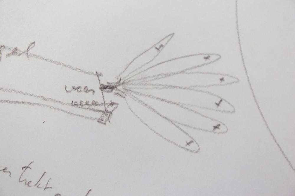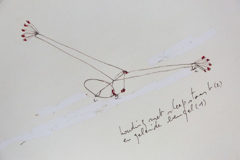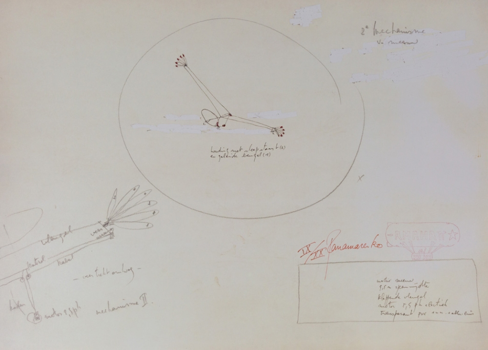 Dit vederlichte luchttuig van doorzichtig plexiglas heeft kleine flappers aan de beide uiteinden van de vleugels, aangeduid met een rood kruisje. Dit fragiele werk , dat duidelijk refereert aan de Raaf, is allicht te broos om ooit de lucht in te gaan. Toch dicht Panamarenko het bijzondere eigenschappen toe.