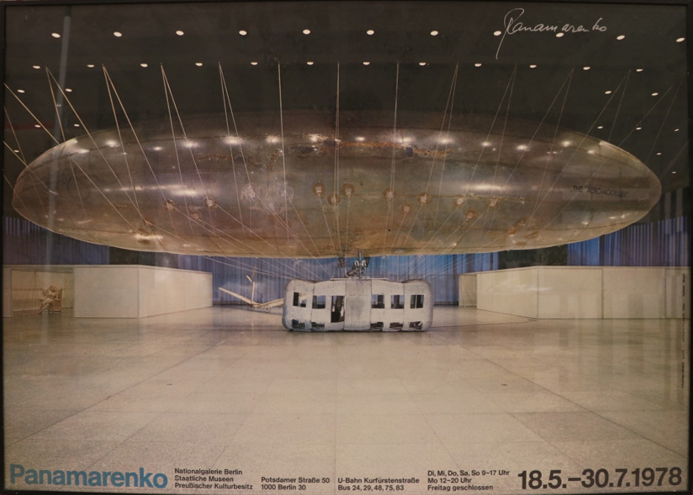 Affiche voor Panamarenko expo uit 1978. Zeer oude affiche die met de hand gesigneerd werd door Panamarenko. Het affiche is ingelijst in een zwarte lijst. Panamarenko studeerde aan de Antwerpse Academie. Vóór 1968 leunde hij aan bij de pop-art, maar hij raakte algauw in de ban van het vliegtuig en vliegen op eigen kracht. Panamarenko is een pseudoniem en een samentrekking van "Pan American Airlines and Company". Aldus ontstonden, sinds 1970, zijn schaalmodellen van talrijke imaginaire voertuigen, vliegtuigen, ballonnen of helikopters in alle mogelijke origineel-verrassende vormen. Het zijn evenveel varianten op de droom van het vliegen van de mythologische figuur Icarus. Of deze tuigen echt kunnen vliegen is deel van het mysterie en de aantrekkingskracht.