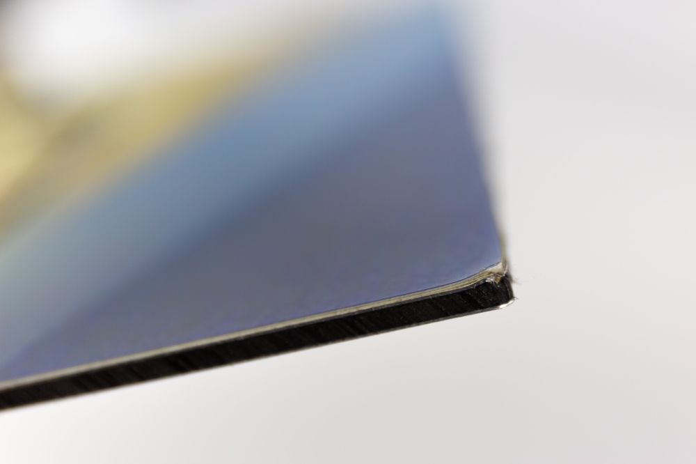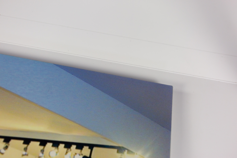 Het werk is klaar om op te hangen via een rail-systeem. Het is in goede staat, maar in de rechterbovenhoek heeft de hoek ooit een duwtje gehad (zie foto 6). Zo goed als onzichtbaar.
