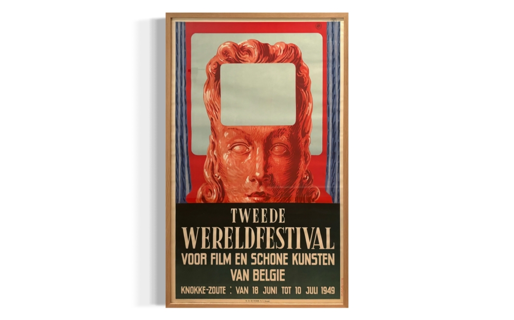 Originele affiche door René Magritte voor het wereldfestival voor film en schone kunsten in Knokke. In zwarte kader. Gesigneerd in de plaat rechts onderaan. Afhaling mogelijk. Verzekerde verzending/levering enkel binnen Benelux.