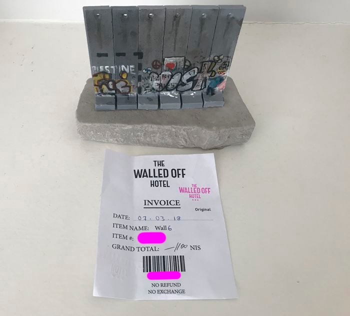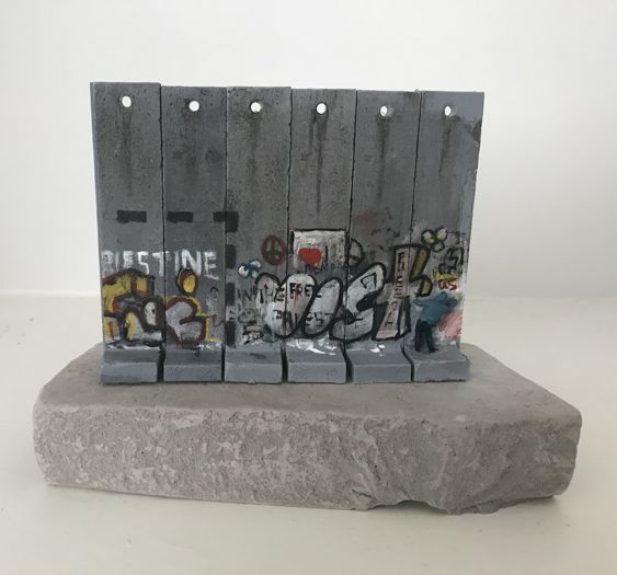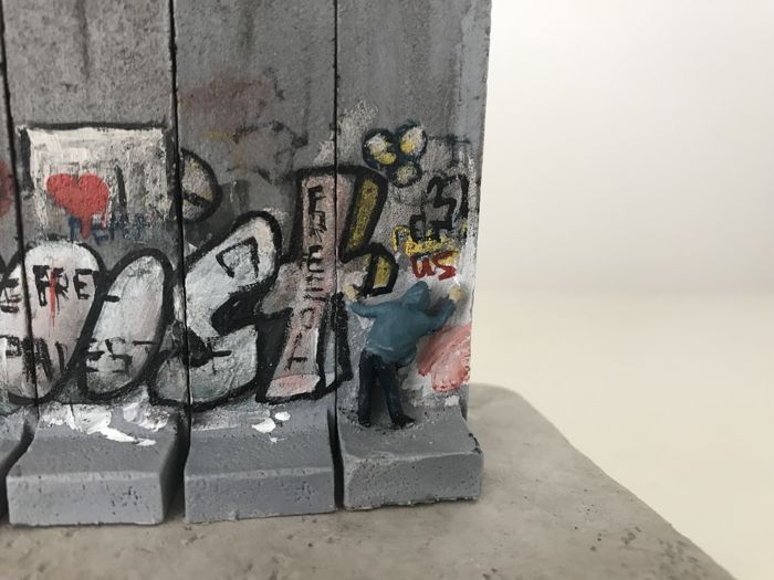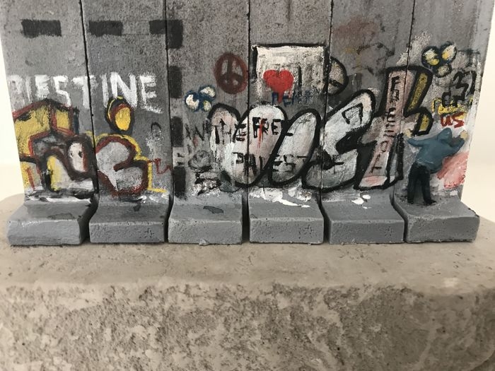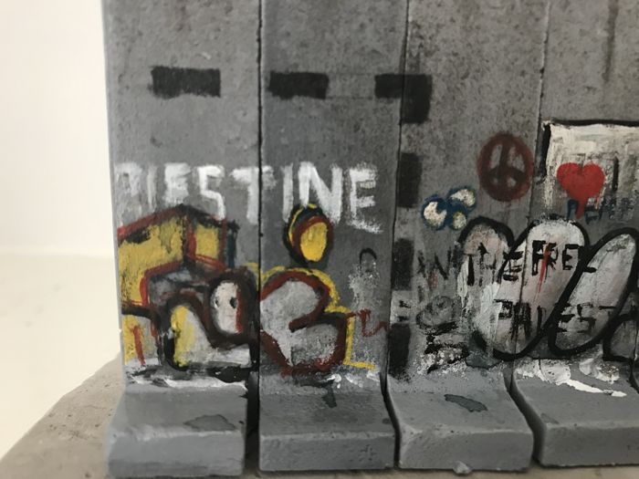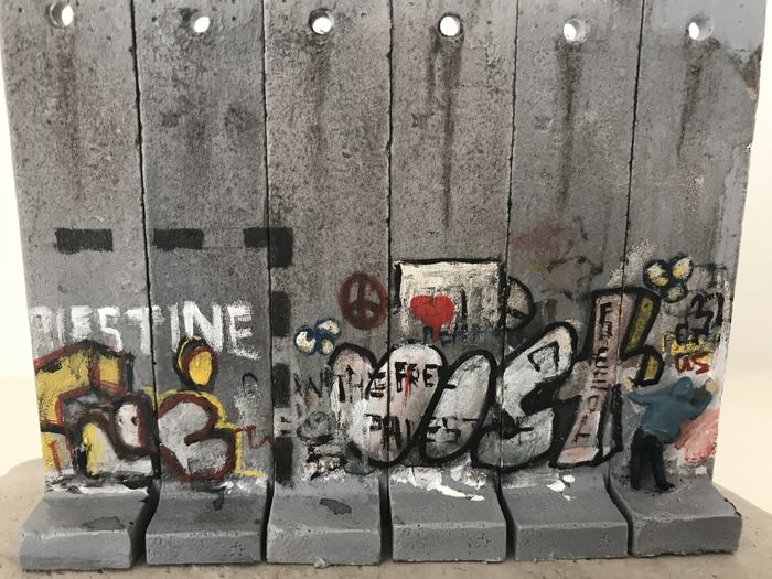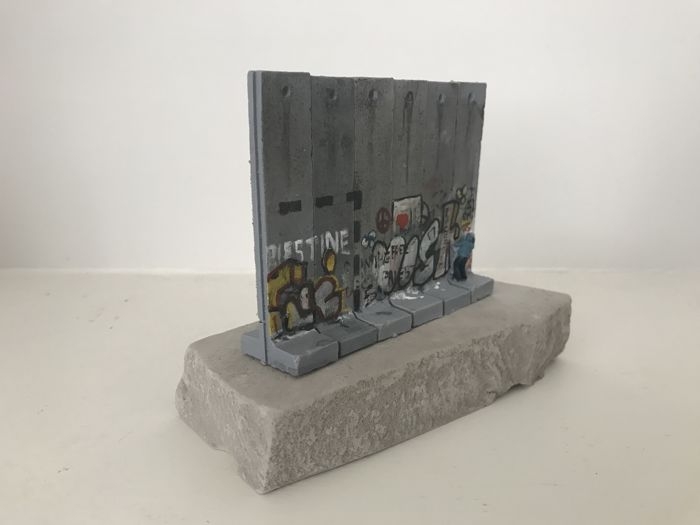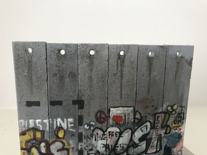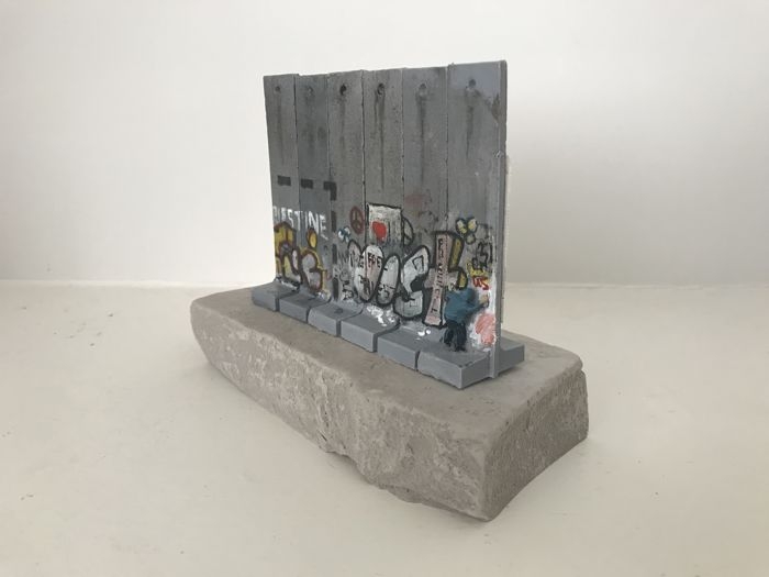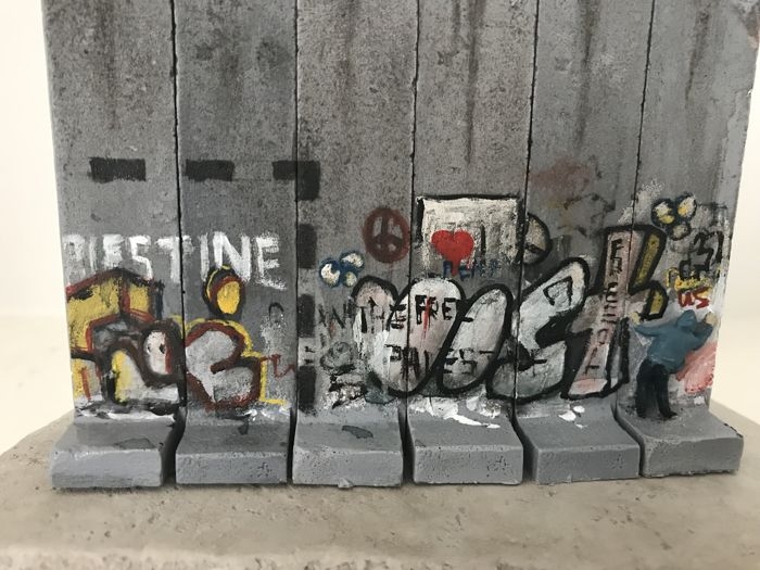 Banksy Souvenir Wall Section-sculptuur. Alleen te koop in het Walled Off Hotel van Banksy in Bethlehem, Palestina. Zeer zelden verkrijgbaar in de WOH-winkel, en als ze er zijn, zijn ze meteen uitverkocht. Vanwege de situatie in het Midden-Oosten is het hotel momenteel gesloten. Dit is een uiterst zeldzame, 6-delige Wall Section uit de vroege editie. Er zijn er maar heel weinig van beschikbaar, en dit is een bijzonder mooi exemplaar, met het Cut It Out-werk van Banksy. Ik ben nog geen van deze tegengekomen met 6 delen. Deze sculpturen worden met de hand beschilderd door lokale kunstenaars en krijgen vervolgens groen licht van Banksy en zijn team voordat ze in de verkoop mogen. Afmeting sculptuur: 12 cm X 9 cm X 3 cm Afmeting basis inbegrepen: 16 cm X 12 cm X 8 cm Van de website van het Walled Off Hotel: Een ministuk van de Seperation Wall versierd met reproducties van geliefde graffiti. Liefdevol met de hand beschilderd door lokale ambachtslieden. Alleen verkrijgbaar in de winkel. Het ontvangstbewijs wordt meegeleverd, wat als authenticatie fungeert. Wordt veilig en volledig verzekerd verpakt verzonden
