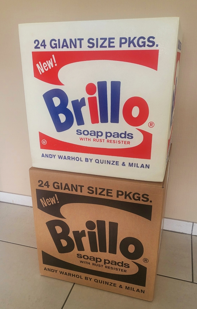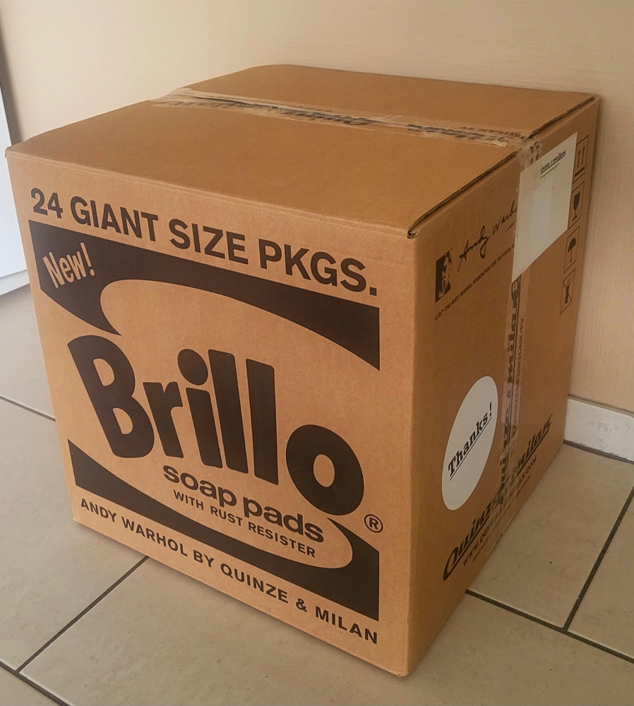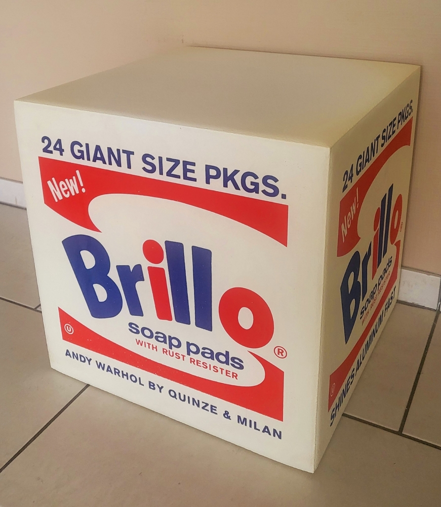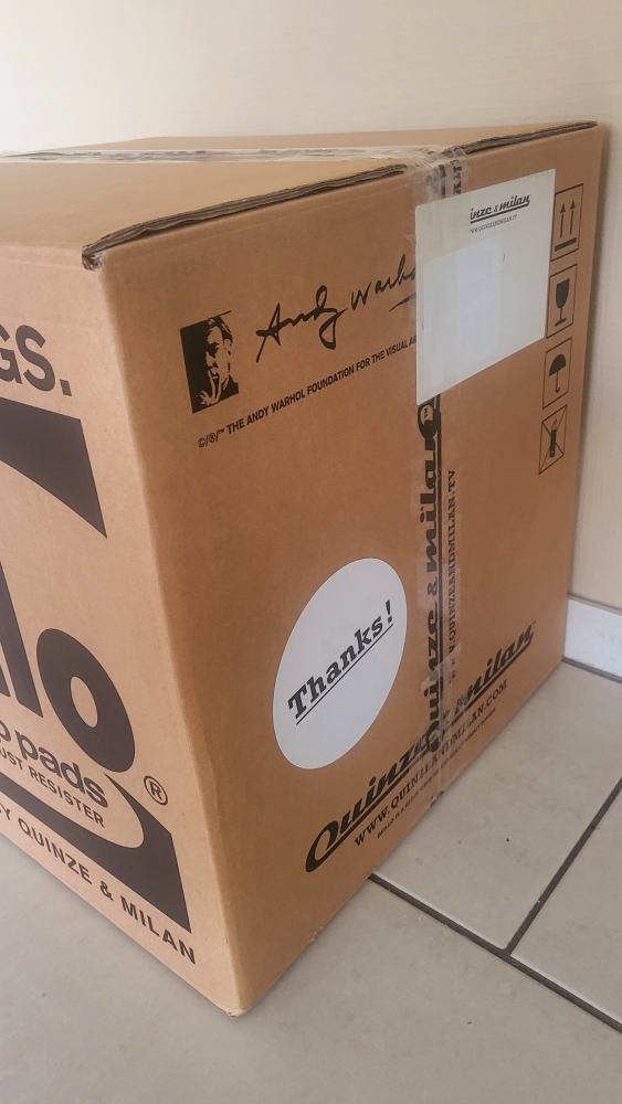 Andy Warhols poef van Quinze & Milan, gemaakt van gepatenteerd schuim Aan vier zijden met zeefdruktechniek het beroemde Brillo Box-ontwerp van Andy Warhol. Gelimiteerde oplage uit 2012, geautoriseerd door de Andy Warhol Foundation. Officiële stempel op de onderkant. 40 x 40 x 40 cm (16 bij 16 bij 16 inch) ca. 3 kg Wordt geleverd met de zeldzame originele verpakking in uitstekende staat. In zeer goede staat (zie foto's). Weinig gebruikt. Licht gelig, gemakkelijk schoon te maken. Een echte blikvanger in uw interieur, voor elke design-, Warhol- en Pop-Art-fan. Wordt zeer zorgvuldig verpakt in de originele verpakking, omgeven door een waterdichte verpakking en wereldwijd verzonden met tracking verzekerd.