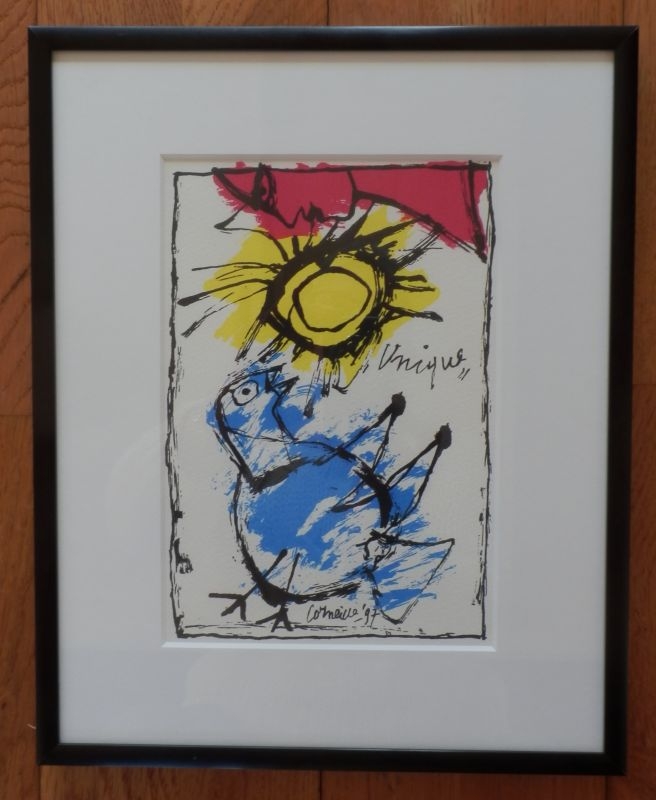 Zeer fraai ingelijst kleurenlitho van de bekende Belgische kunstenaar Corneille. Afmeting zwart aluminium lijst 40 x 30 cm in nieuwstaat. Het werk is in de druk gesigneerd en uitgegeven in samenwerking met uitzendorganisatie Unique in 1997.