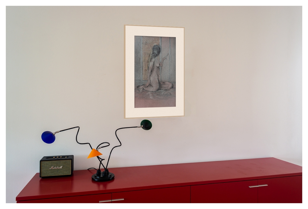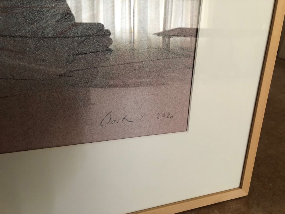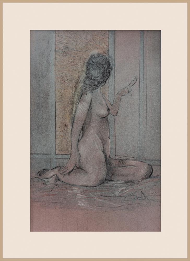 Dit werk is een gemengde techniek op papier. Het is een vrouw die naakt voor een geopend raam naar buiten kijkt.Het is een gemengde techniek op papier in zachte tonen. Lambert Oostrum is nog steeds actief als beeldend kunstenaar. In het begin van zijn loopbaan heeft hij in 1987 de Alfons Blomme prijs gewonnen. Recent werkt Lambert meer abstract met af en toe wat figuratie. In 2018 is hij genomineerd voor de Herman Krikhaarprijs in Almelo . Het schilderij van de nominatie heet: Fresh Product Het een en ander is te lezen op zijn website: www.lambertoostrum.nl