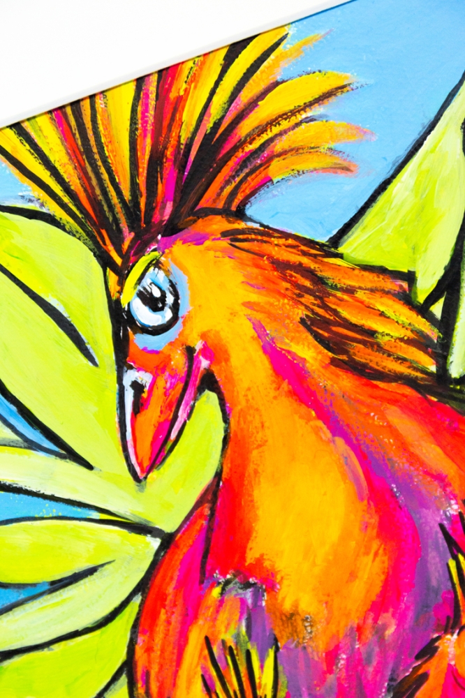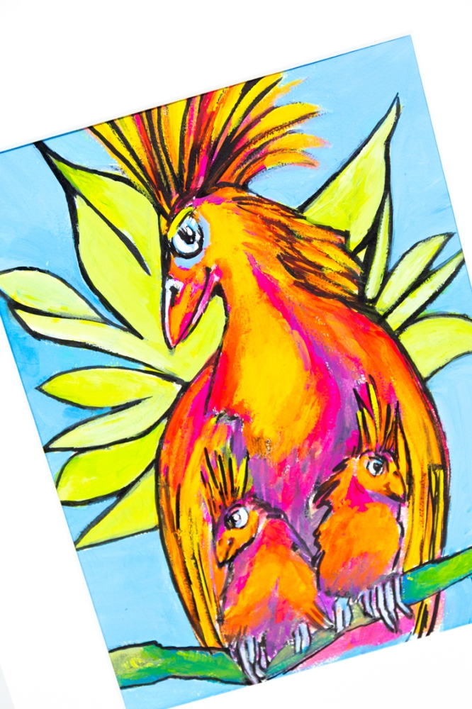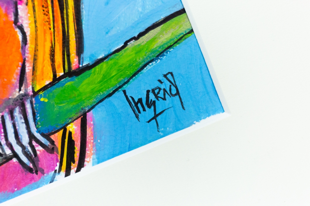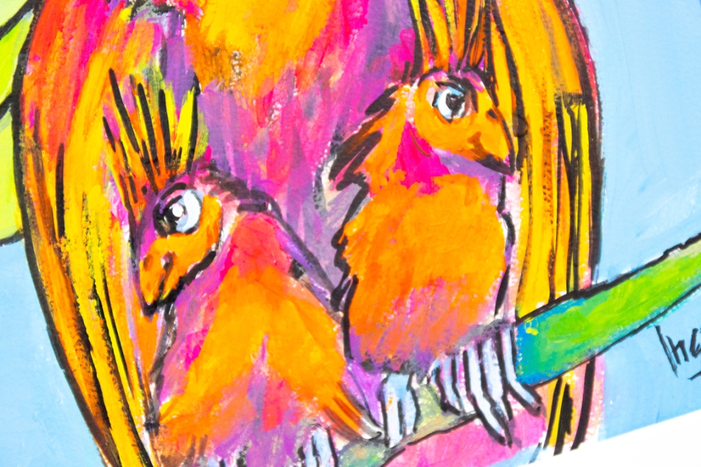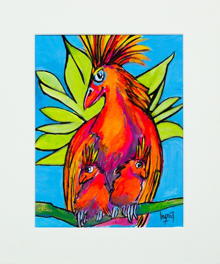 Levendig en kleurrijk werkje van Ingrid met Acrylverf en chinese inkt op papier. Ingrid (Janssen) is een Belgische schilder, grafisch ontwerper, opleiding aan de Academies van Doornik, Oostende en Duinkerken. Figuratieve stijl doordrenkt met symboliek.