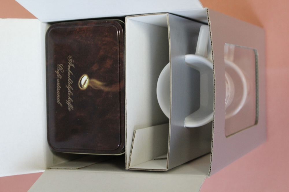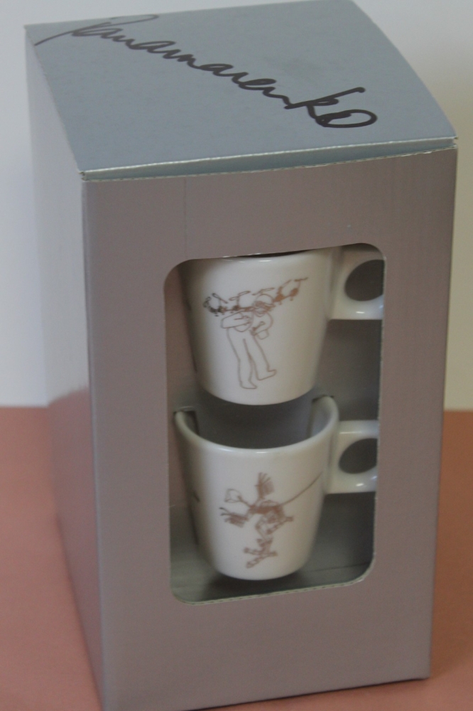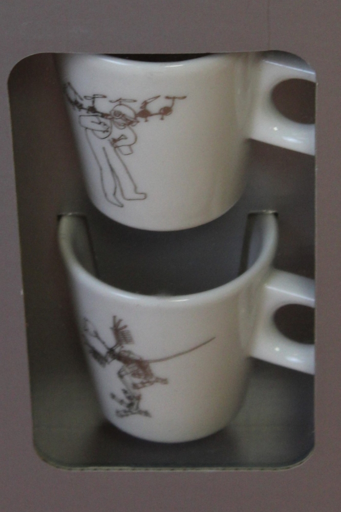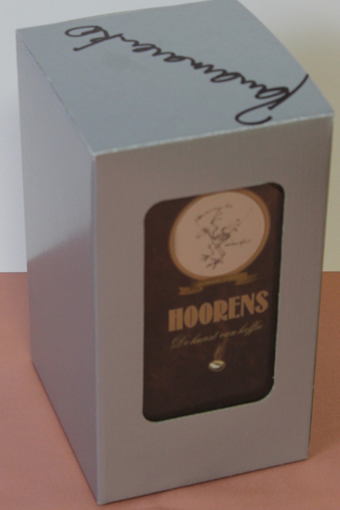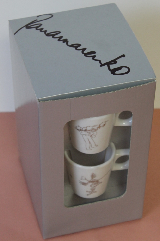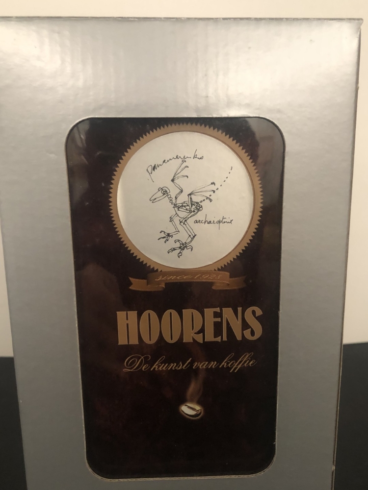 Box is handgesigneerd bovenaan met zwarte stift. Zeldzame complete set van 2 kopjes met afbeeldingen van 2 objecten van Panamarenko. De afbeeldingen betreffen Pepto Bismo en Archaeopteryx. Box bevat ook blik Hoorens koffie met daarop afbeelding van Archaeopteryx. Uitgegeven door Hoorens koffie in 2005.