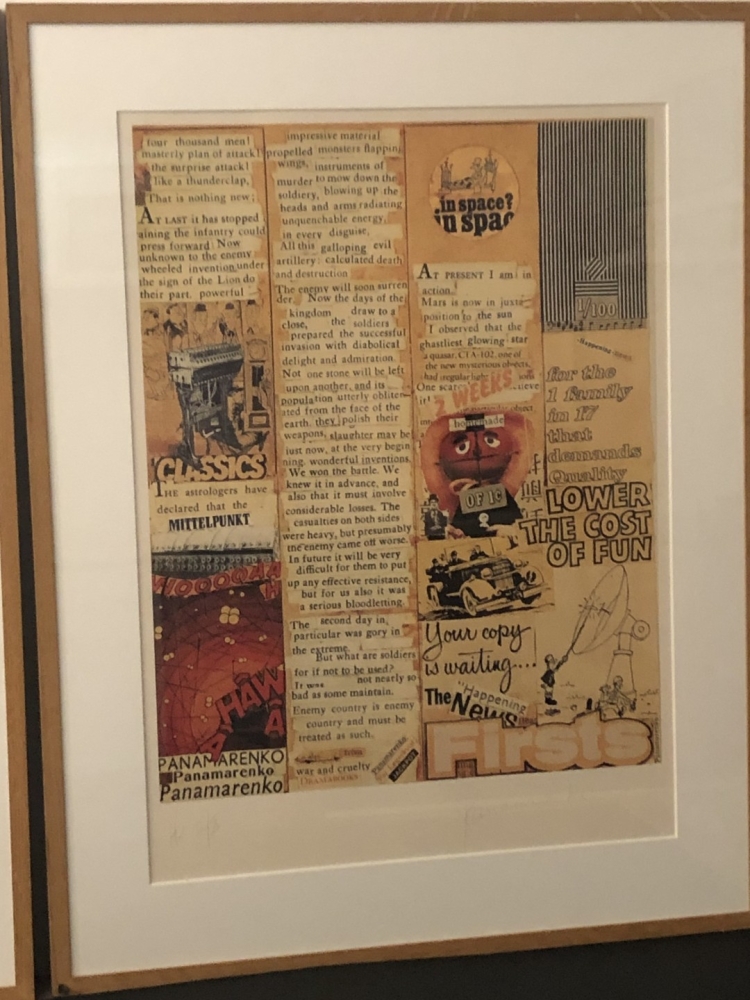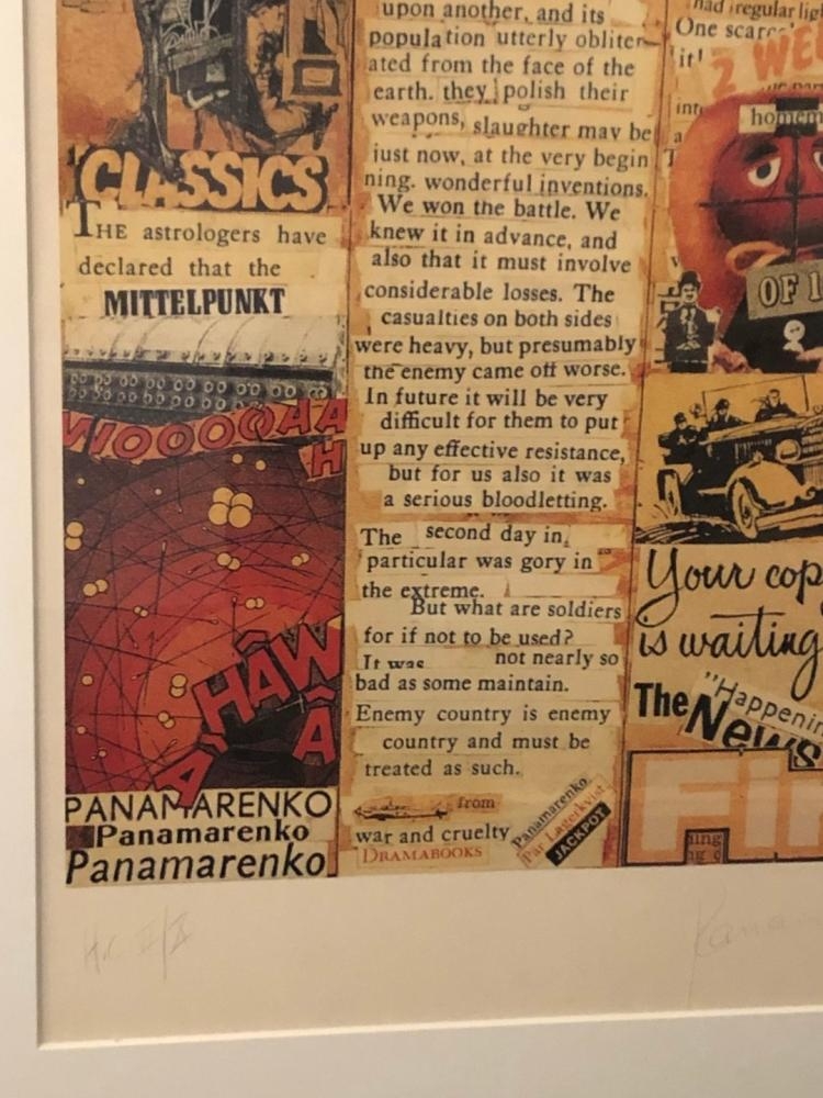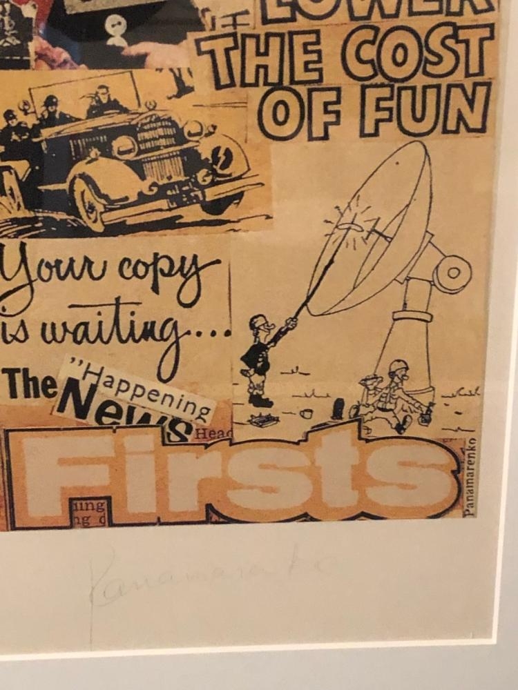 Deze 'In space' is een 'Milkyways and Happenings' editie (met opgehoogde collage-stukken). Handgesigneerd door Panamarenko. Ref. literatuur: multiple 112 (boek multiples part 3, pag. 6). In Space is één van de zeven werken uit de portfolio Milkyways and Happenings. Deze werken zijn hernemingen van de oorspronkelijk in de jaren '60 door Panamarenko gemaakte collage's voor het happening news magazine. Uitgegeven ter gelegenheid van de opening van de Antwerpse Luchtschipbouw door galeriehouder Ronny Van de Velde in 2003. De collages behoren tot Panamarenko's eerste avant-gardistische werk en zijn door hem samengesteld uit beeld- en tekst-fragmenten uit Amerikaanse, technisch-wetenschappelijke tijdschriften. Ten gevolge van de omvang en kwetsbaarheid van dit werk is levering enkel mogelijk in Oost-en West-Vlaanderen en Antwerpen (1 euro per km). Afhaling te Gent is mogelijk op een voor koper geschikt moment volgens afspraak.