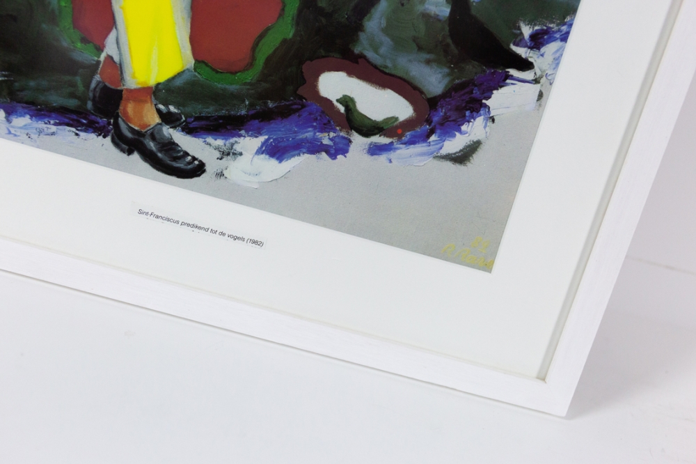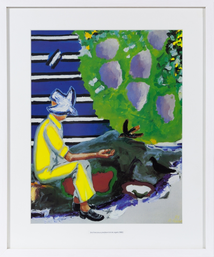 Een print van Roger Raveel's werk "Sint-Franciscus predikend tot de vogels" uit 1982 afkomstig van een luxekalender uit 1988 of 1992 in beperkte oplage uitgegeven door NV Blonde/Zannekin uit wommelgem.