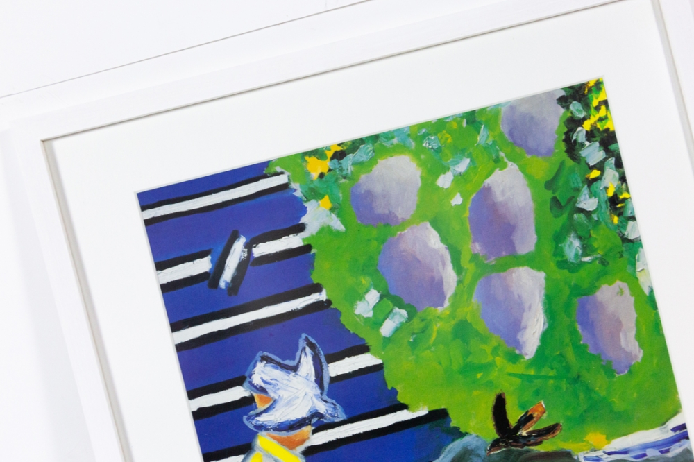Handtekening gedrukt en sober maar mooi ingekaderd in een witte lijst met passe-partout. Lijst en werk in uitstekende tot perfecte staat.