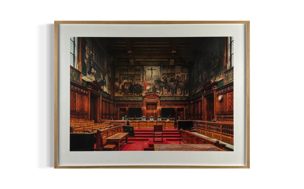 Foto op slechts 5 exemplaren van Karin Borghouts. Professioneel ingelijst. Nummer 1/5. Gedateerd en gesigneerd op verso. Getiteld: Antwerpen, Oud Gerechtshof, Hof van Assisen 2016.
