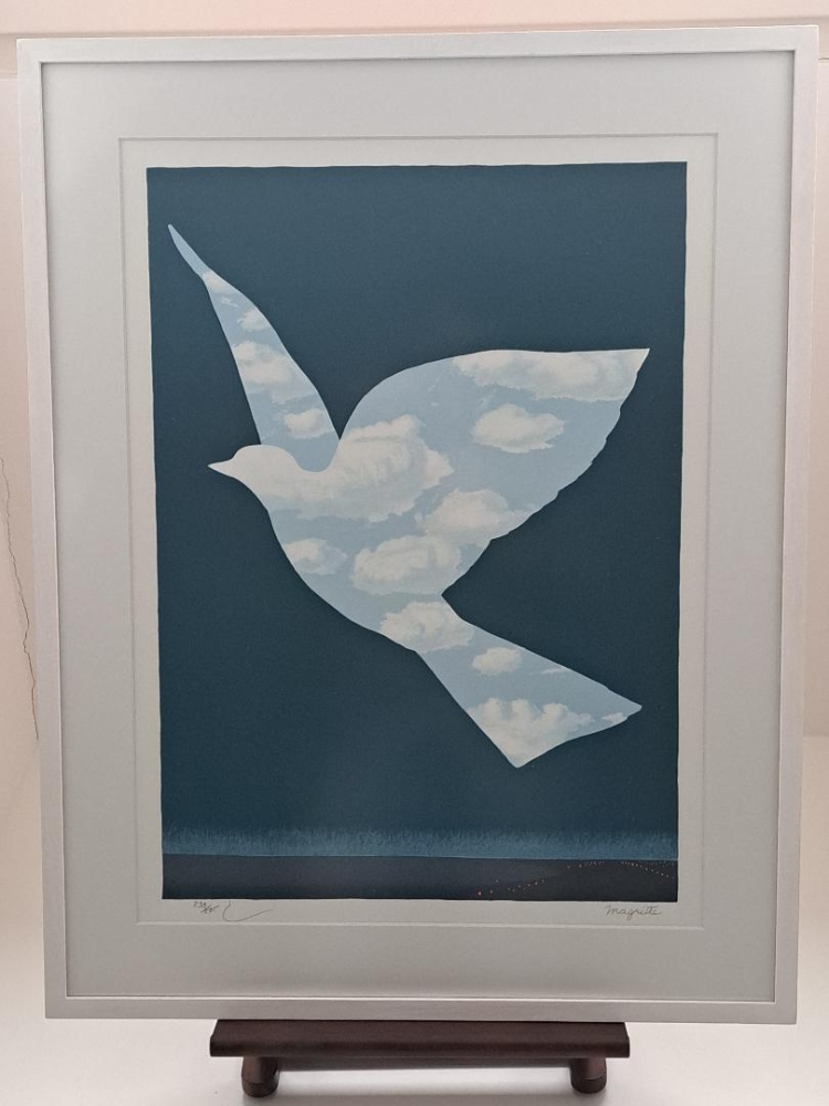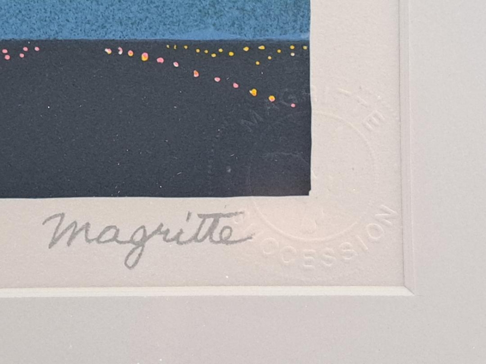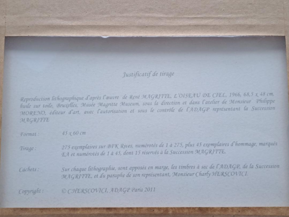 Kleurenlithografie naar het gelijknamige werk van René MAGRITTE. Getekend met naamstempel en handtekening van Charly Herscovici Genummerd op 275 exemplaren en met blindstempel "Succesion Magritte" en blindstempel "ADAGP Paris 2011" Afmetingen blad (hxb) : 60 x 45 cm Afmetingen kader : 70 x 54 cm Uitgegeven in Parijs in 2011 met goedkeuring en onder controle van het ADAGP Parijs die de nalatenschap Magritte beheert en met de handtekening van zijn vertegenwoordiger Charly Herscovici Bewijs van uitgave is geprint op de achterzijde van de litho en zichtbaar in de nieuwe professionele inlijsting. Met certificaat van echtheid van Hus Gallery, Parijs