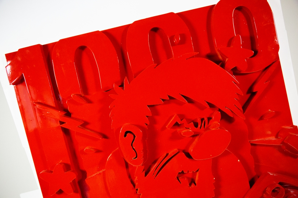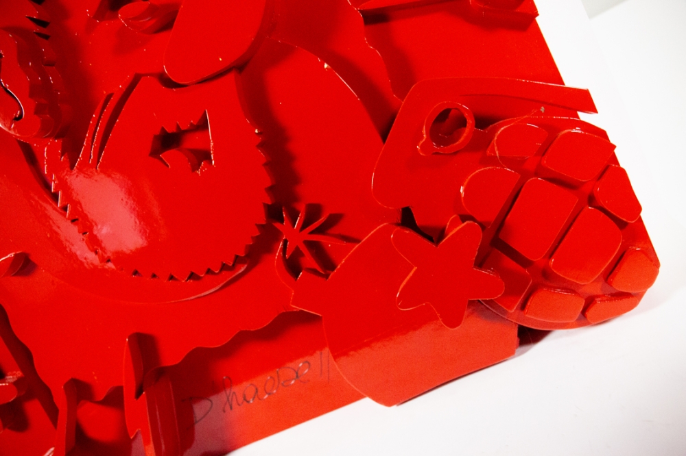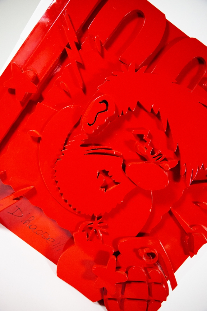 Een mixed media werk van Hannes D'Haese, gemaakt uit gelaagde houtplaten van bijna 2cm dik. Gezien er op sommige plaatsen een 6-tal lagen te tellen zijn heeft dit werk een grote dimensionaliteit.