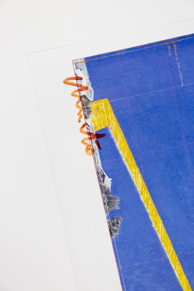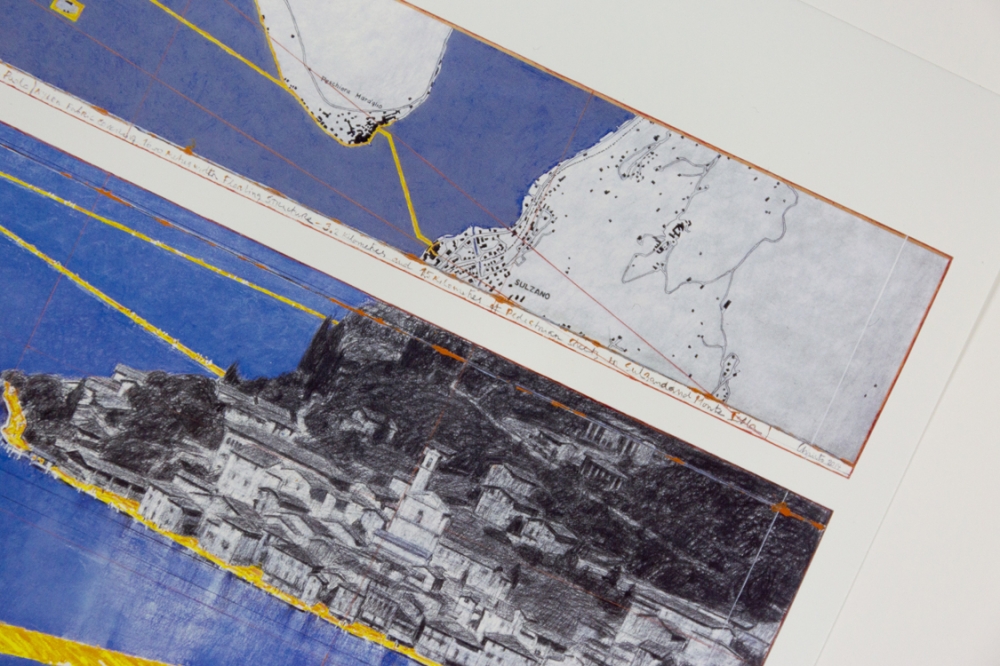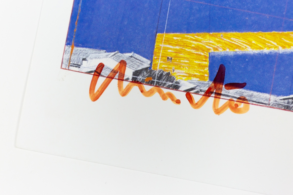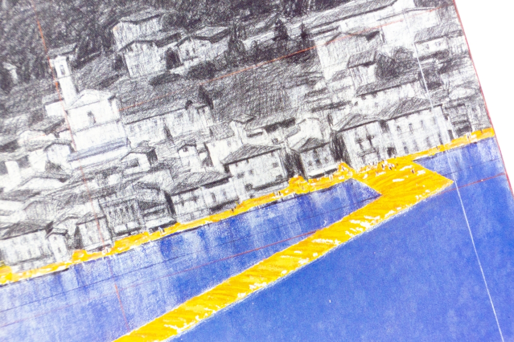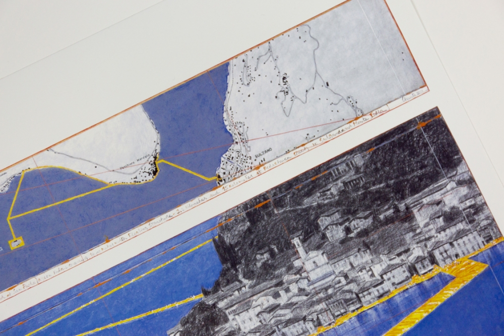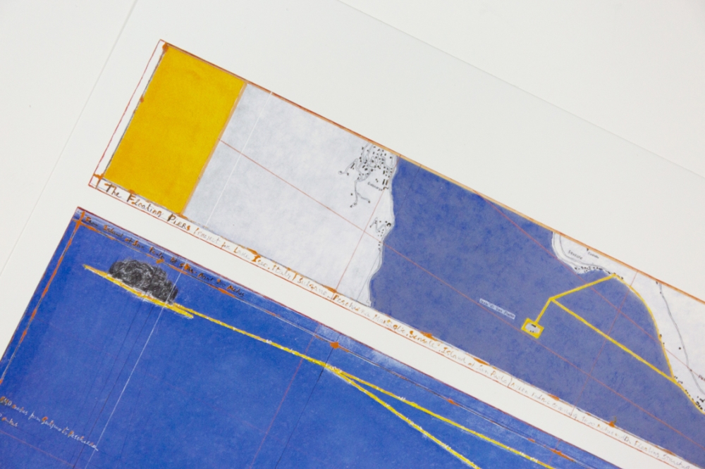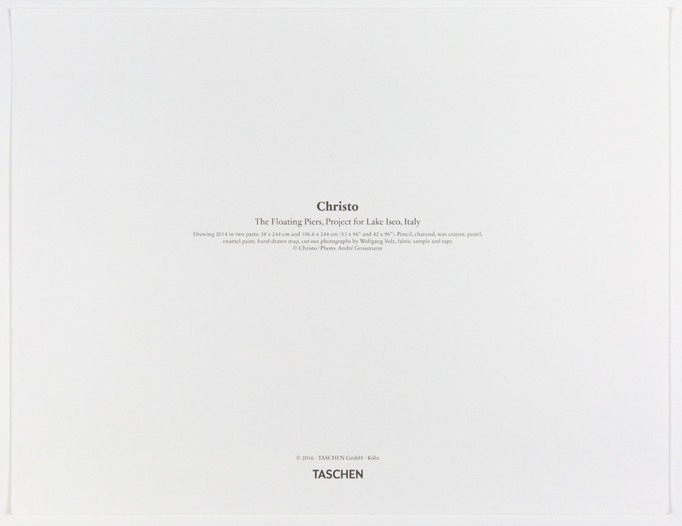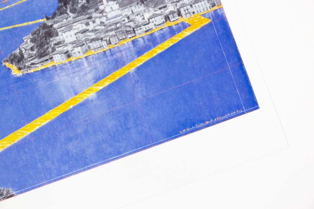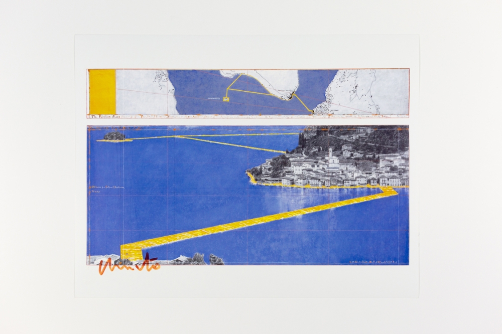 Offsetkleurendruk van "The Floating Piers" een ontwerp voor een tussen 2014 en 2016 gerealiseerd project in Italië, op het Iseo meer. De constructie is op zijn zachtst gezegd indrukwekkend te noemen en vervaagt klaarblijkelijk de grens tussen werkelijkheid en fantasie. Volledig door Christo zelf gefinancierd, bleef deze 16-daagse exhibitie gratis toegankelijk voor het grote publiek.