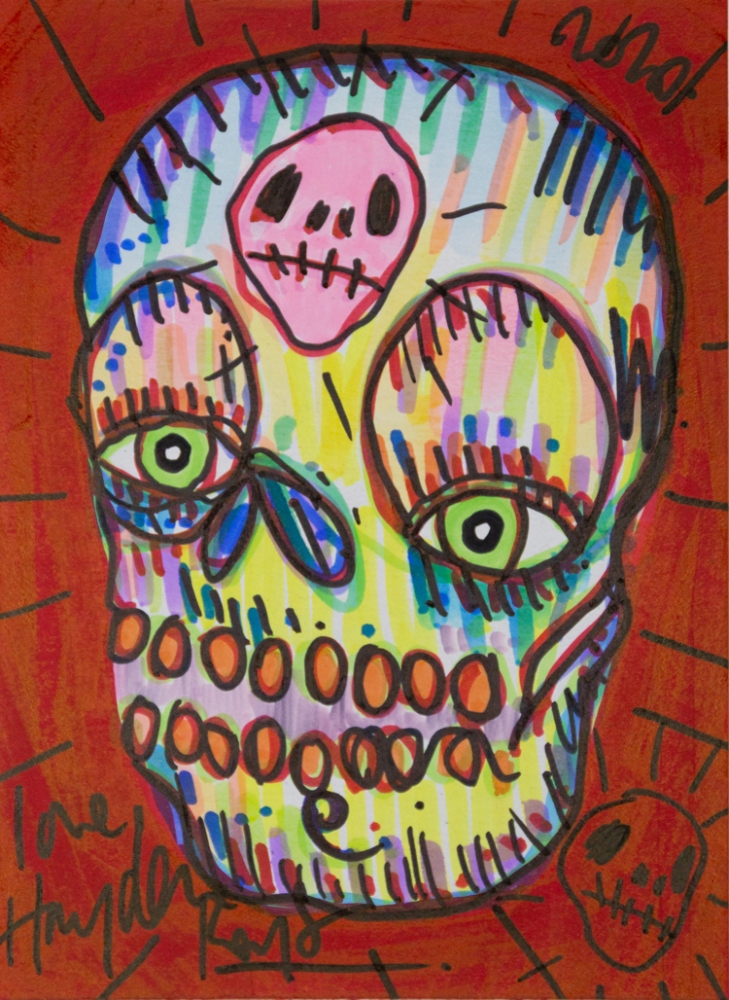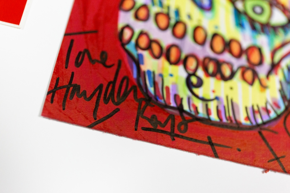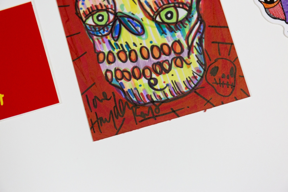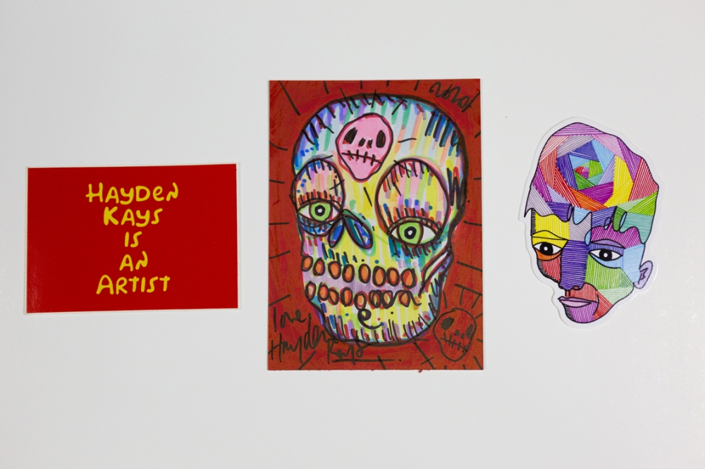 Een met de hand gemaakt werkje van Hayden Kays op een postkaart. Bij dit werkje zitten ook twee stickers van Hayden Kays.