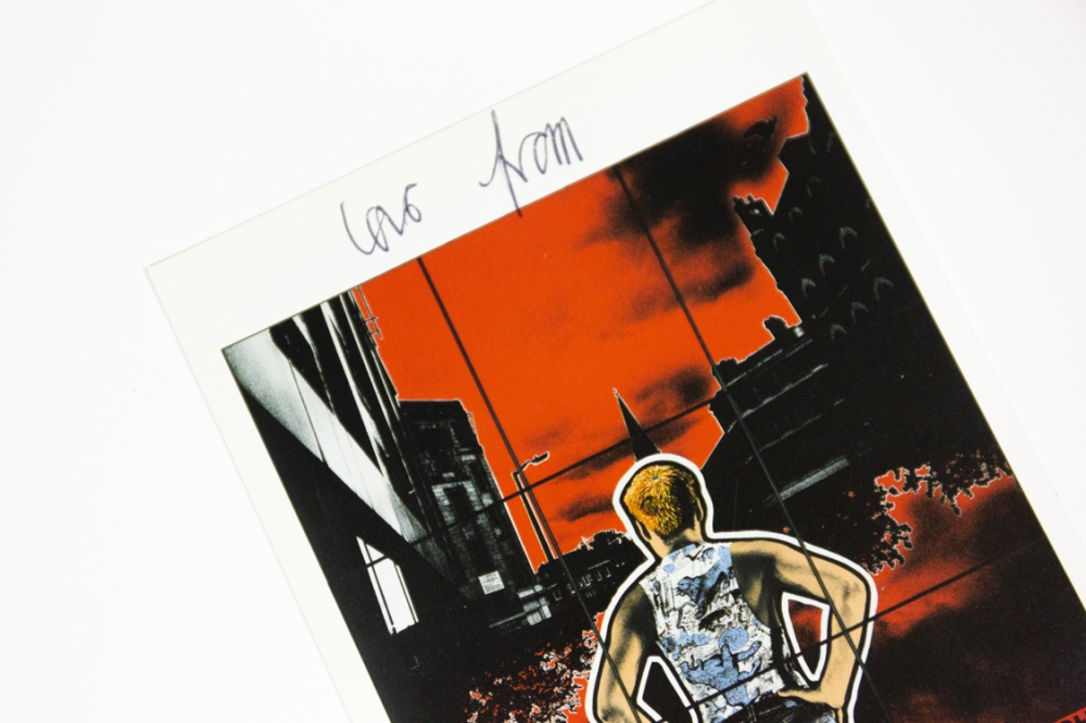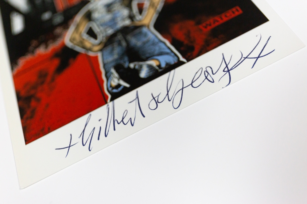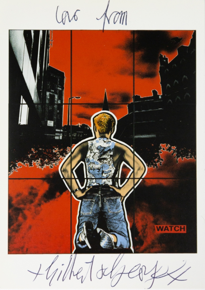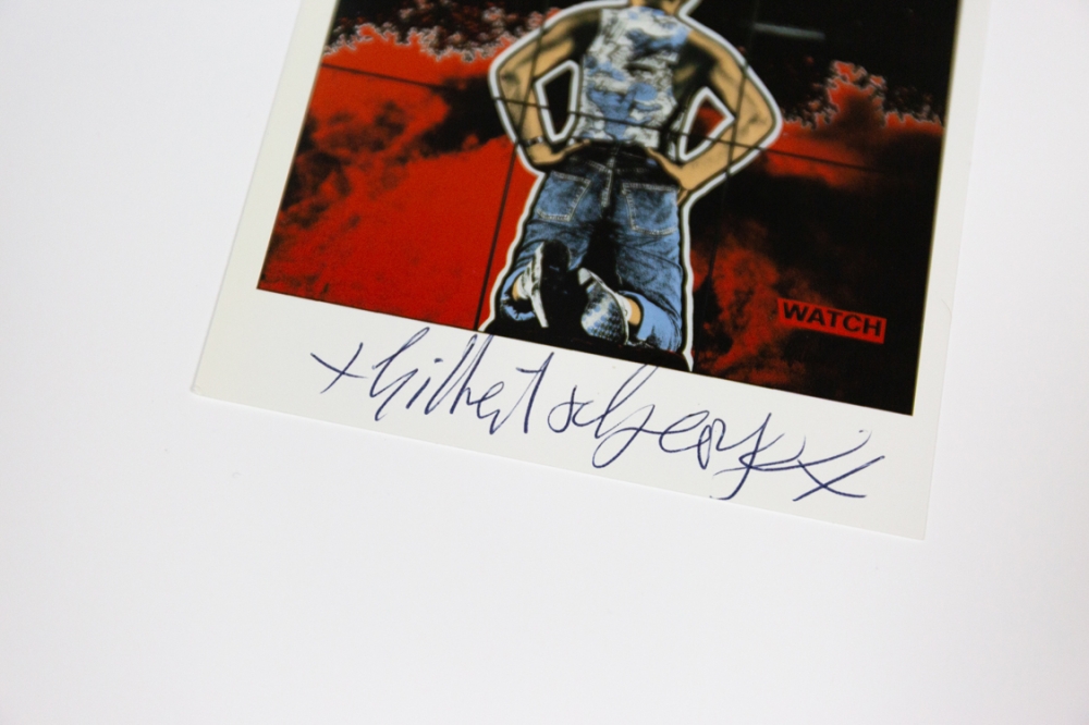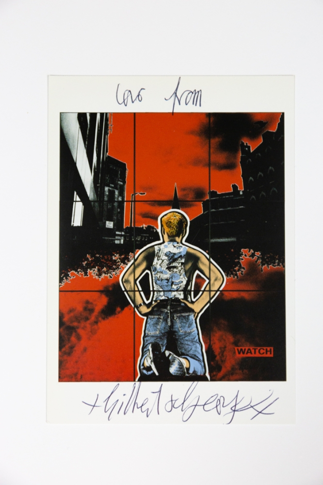 Een gesigneerd postkaartje van Gilbert and George, brits kunstenaarsduo dat bekend werd met performances en grote fotowerken achter glas.