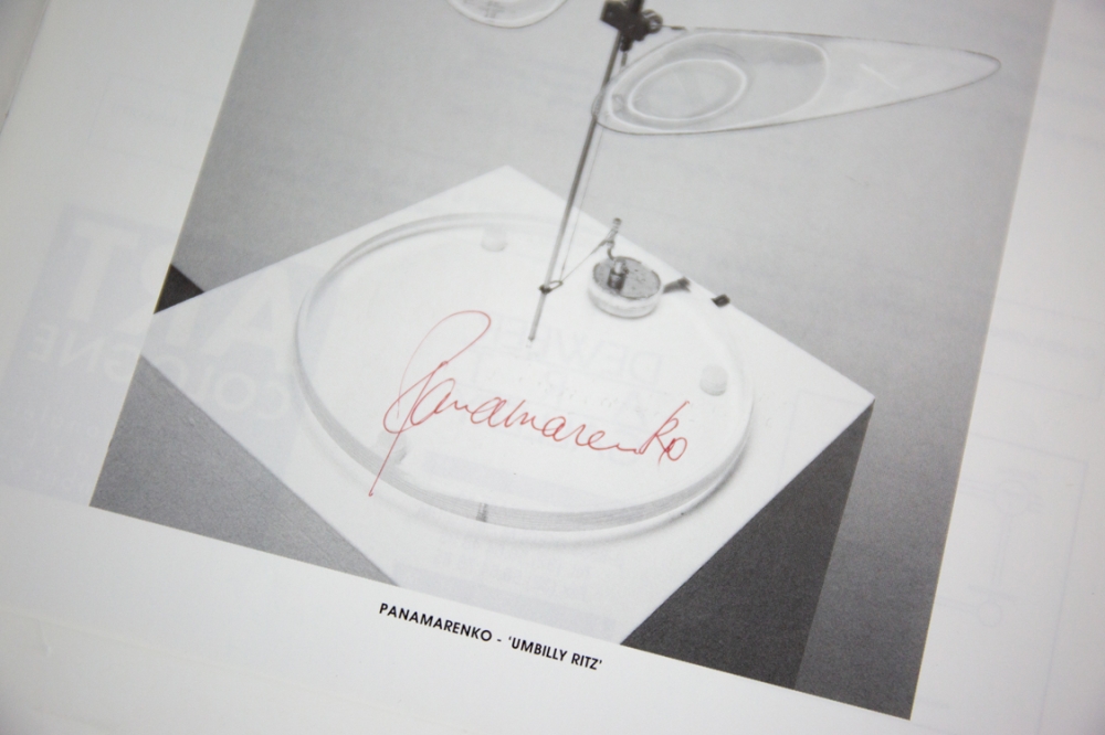 Het werk is gesigneerd aan de binnenkant onder een afbeelding van het werk Umbilly Ritz. Breedte van de brochure geopend is 22cm.