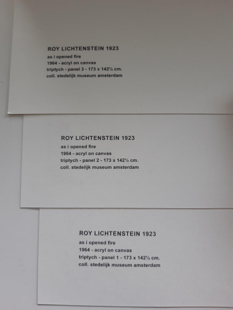 As I opened Fire. Triptiek Roy Lichtenstein was een Amerikaanse popartiest. In de jaren zestig werd hij, samen met onder andere Andy Warhol, Jasper Johns en James Rosenquist, een leidende figuur in de nieuwe kunstbeweging. Zijn werk definieerde het uitgangspunt van popart door middel van parodie. Geïnspireerd door de strip, maakte Lichtenstein precieze composities die documenteerden terwijl ze geparodieerd werden, vaak op een ironische manier. Zijn werk werd beïnvloed door populaire reclame en de stripstijl. Dit werk is bedacht in 1966 en uitgegeven door het Stedelijk Musseum. Dit stuk is van een oplage gedrukt na 1966, maar vóór 1997, overlijdensdatum van de kunstenaar. Erg belangrijk. De datum van zijn overlijden wordt niet weergegeven. In andere edities verschijnt Roy Lichtenstein 1923 - 1997. Dat betekent dat het edities zijn na zijn dood. Hierin verschijnt de sterfdatum niet. Uitgegeven door het Stedelijk Museum, Amsterdam, Gedrukt in Nederland Afmetingen: 63 x 52,5 cm elk x 3 Zeer goede staat