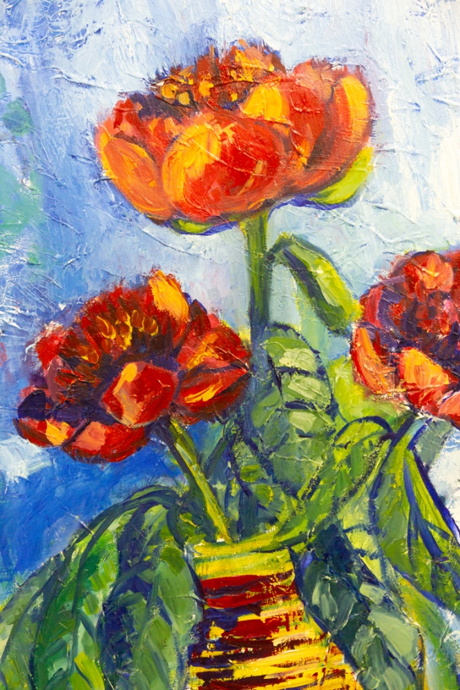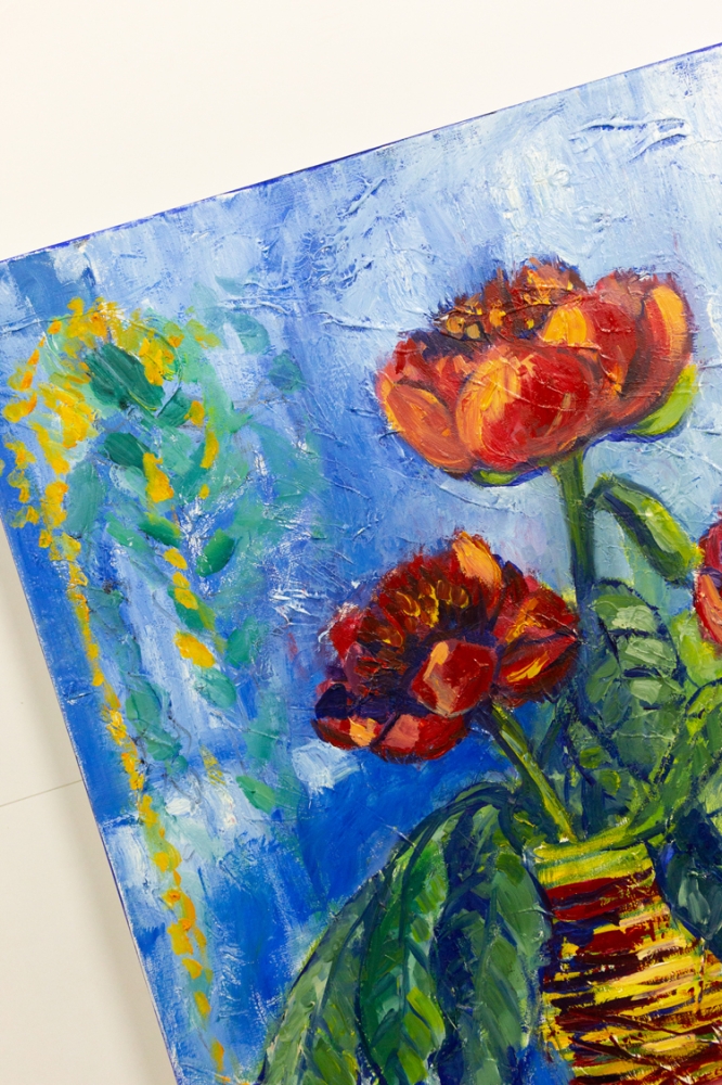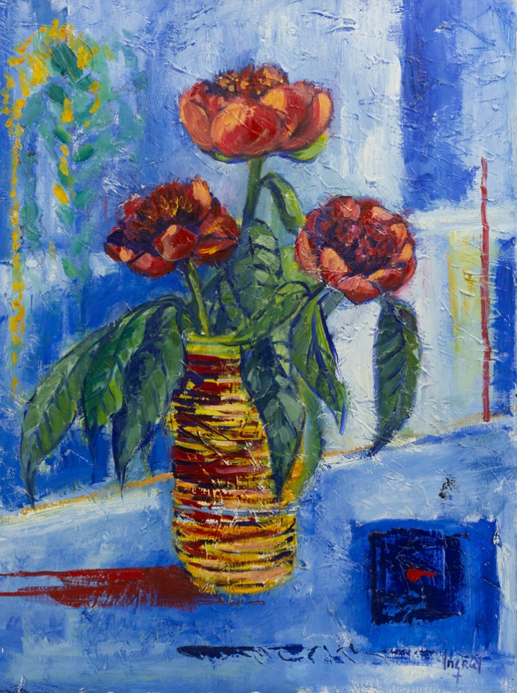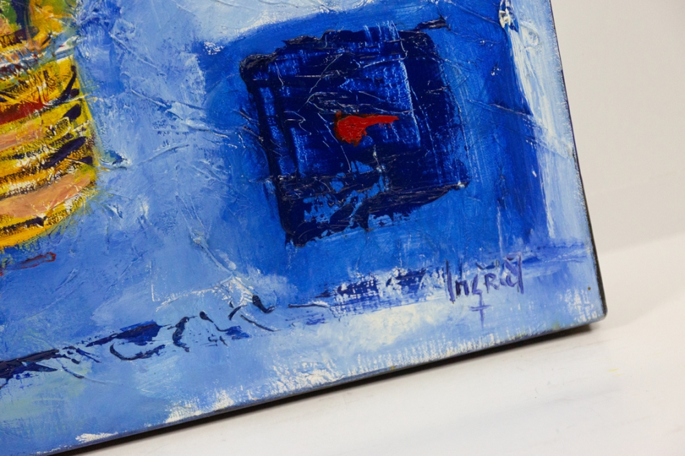 Vrolijk en kleurrijk werk van Ingrid op canvas. Ingrid (Janssen) is een Belgische schilder, grafisch ontwerper, opleiding aan de Academies van Doornik, Oostende en Duinkerken. Figuratieve stijl doordrenkt met symboliek.