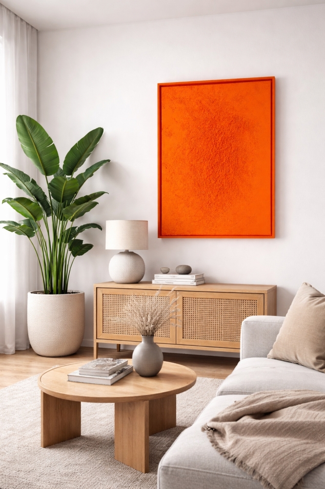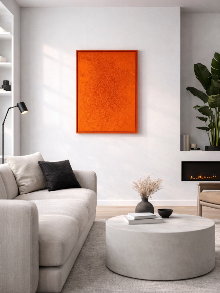 Papaya breeze ✨ Een krachtig en warm kunstwerk dat meteen de aandacht trekt. Papaya Breeze straalt energie en rust tegelijk uit dankzij de levendige oranje tint, geïnspireerd op zonovergoten landschappen en tropische warmte. De rijke textuur, opgebouwd met structuurverf, geeft het werk een tastbare diepte en een speels reliëf. Het oppervlak leeft door subtiele variaties en onregelmatigheden, waardoor het licht telkens anders valt en het kunstwerk vanuit elke hoek een nieuwe uitstraling krijgt. De strakke omlijsting en minimalistische compositie zorgen voor een modern en stijlvol geheel, perfect passend in een hip en eigentijds interieur. Dit werk fungeert als een statement piece dat warmte toevoegt aan een rustige, neutrale ruimte. Details Afmeting: 70 x 90 cm Materiaal: acrylverf & structuurverf Uniek, handgemaakt kunstwerk Een ode aan zon, warmte en eenvoud Papaya Breeze brengt instant sfeer in elke ruimte.