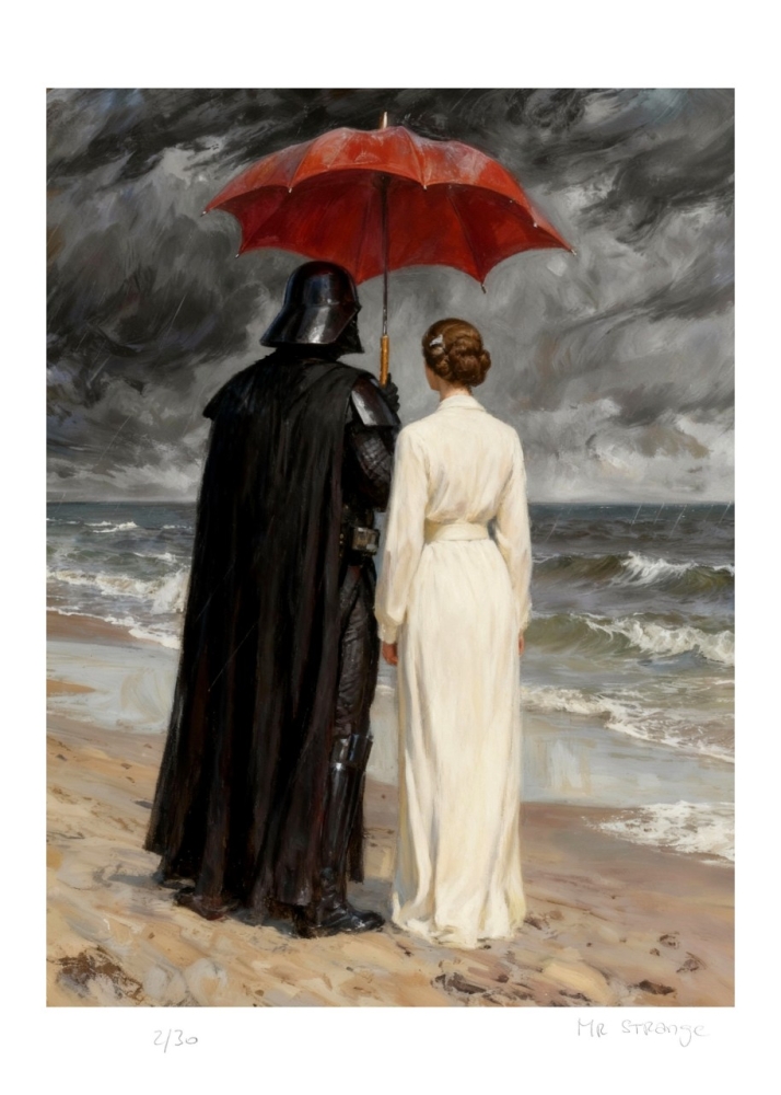 Mr Strange (Jean-Marie Gitard) est un artiste français engagé dans le surréalisme. Artiste côté et confirmé, il est présent dans de nombreuses collections en France et à l'étranger. Retour sur Terre (Darth et Leia) - 2025 Giclée sur papier Hanhemühle. Epreuve 2/30 numérotée et signée à la main dans la marge blanche. Cachet de l'artiste embossé à sec. Envoyée avec un certificat d'authenticité. Dimension totale: 70 x 50 cm. Le bord blanc facilitera la mise en place de l'uvre dans un passe-partout. Neuve / jamais encadrée. Envoyée par transporteur dans un tube adapté.