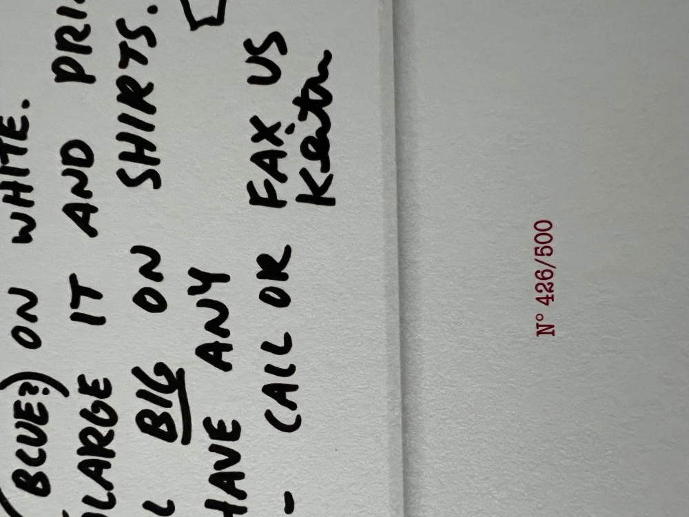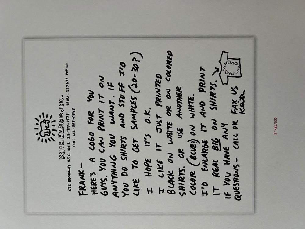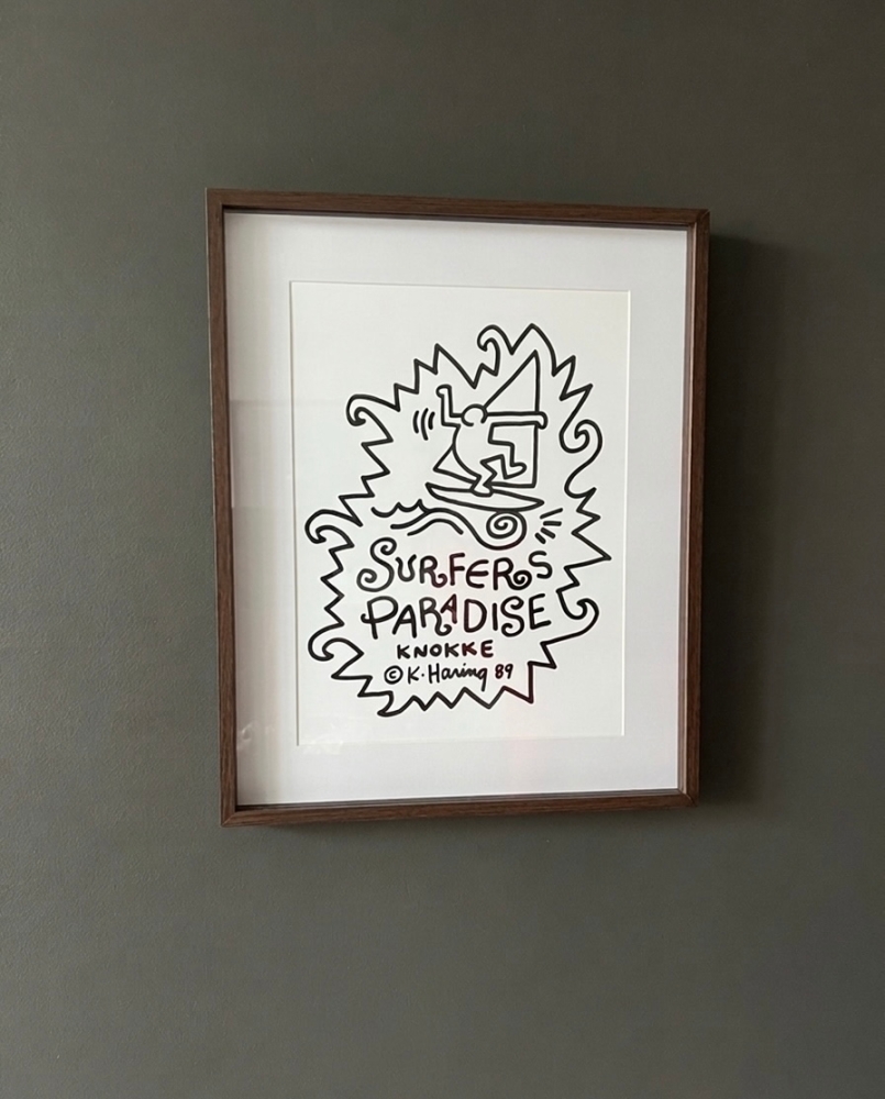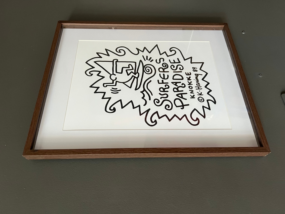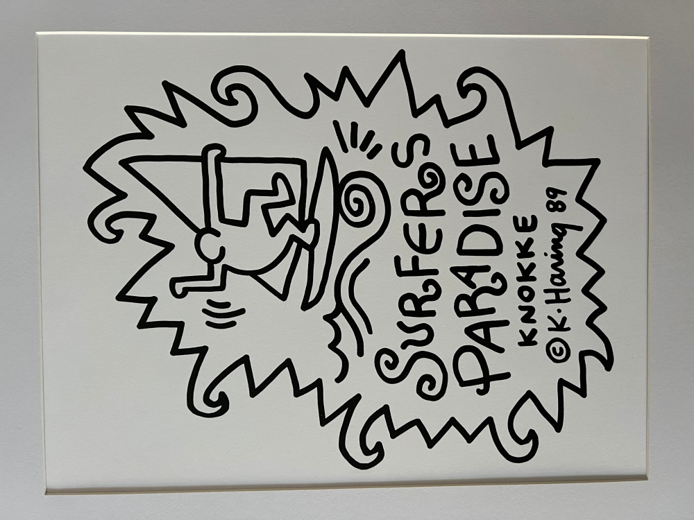 500 genummerde afdrukken van het logo op mat wit A3 karton op de voorzijde. Op de ommezijde staat de afdruk van de bijhorende persoonlijke brief die Keith schreef als begeleiding en bewijs van authenticiteit . De verkoop van deze aangeboden editie is nummer 426 /500. De handtekening is in de druk geplaatst , dus niet hand gesigneerd, de nummering werd machinaal aangebracht in rode inkt op de ommezijde. Het betreft dus een reproductie van de origine tekening op de voorzijde en van de brief op de ommezijde uitgegeven in 2020. Gedurende de jaren 1987, 1988 en 1989 was de bekende Amerikaanse kunstenaar Keith Haring een graag geziene gast in Knokke-Heist. In zijn vrije tijd vertoefde hij graag op Surfers Paradise waar hij leerde surfen en genoot van het relaxte strandleven. Als dank maakte hij speciaal voor de club in 1989 een uniek Surfers Paradise logo: een windsurfer op een golf. Surfers Paradise had in die tijd 160 leden en iedereen kreeg dan ook meteen een T-Shirt met dit logo op.