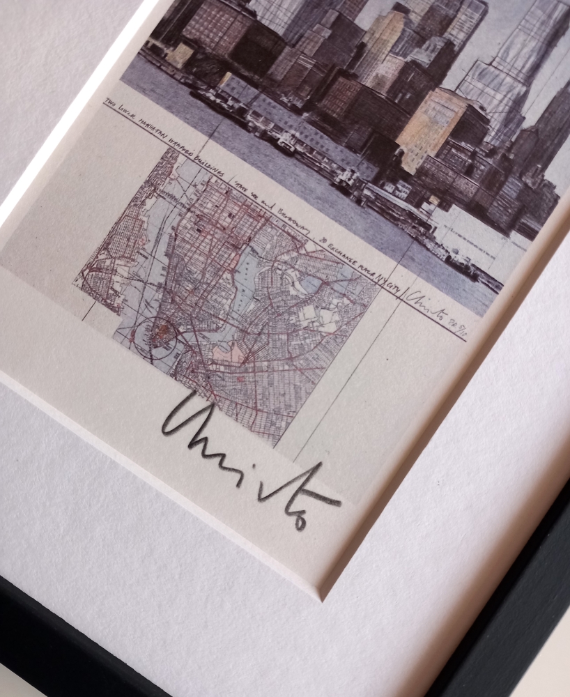 Uniek en uiterst zeldzaam! Project: Two Lower Manhattan Wrapped Buildings, Project for New York City, 1964-1966. Handgesigneerd door Christo. © Nouvelles Images S.A. ¬Ėditeurs et Christo 1985 Photo: Jeanne-Claude Professioneel ingelijst in zwart houten frame met passe-partout en acrylglas. Lijst: 18,6 x 23,6 x 1,15 cm (B x H x D). Uitleg bij het afgebeelde werk: Christo / Two Lower Manhattan Wrapped Buildings, Project for New York City / lithographie et collage 1979 / 71 x 56 cm / photo Jeanne-Claude / coll. Harrison Rivera-Terreaux In februari 1964 arriveerden Christo en Jeanne-Claude in New York. Kort nadat ze de hoge gebouwen van het centrum van Manhattan hadden gezien, kwamen ze op het idee om twee New Yorkse wolkenkrabbers in te pakken. Deze gesigneerde print verbeeldt de iconische skyline van New York City gehuld in stof, waardoor de bekende architectuur van wolkenkrabbers wordt getransformeerd in abstracte, sculpturale vormen.