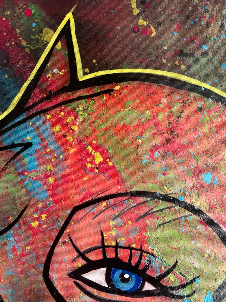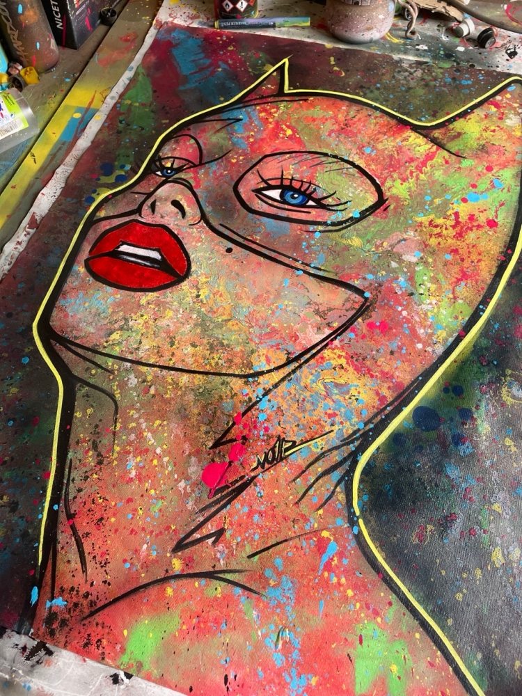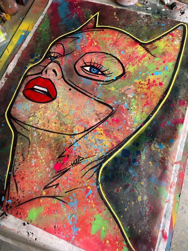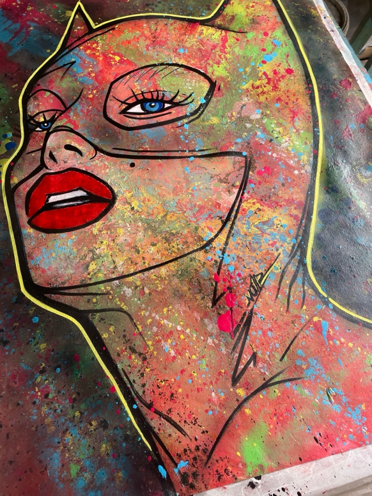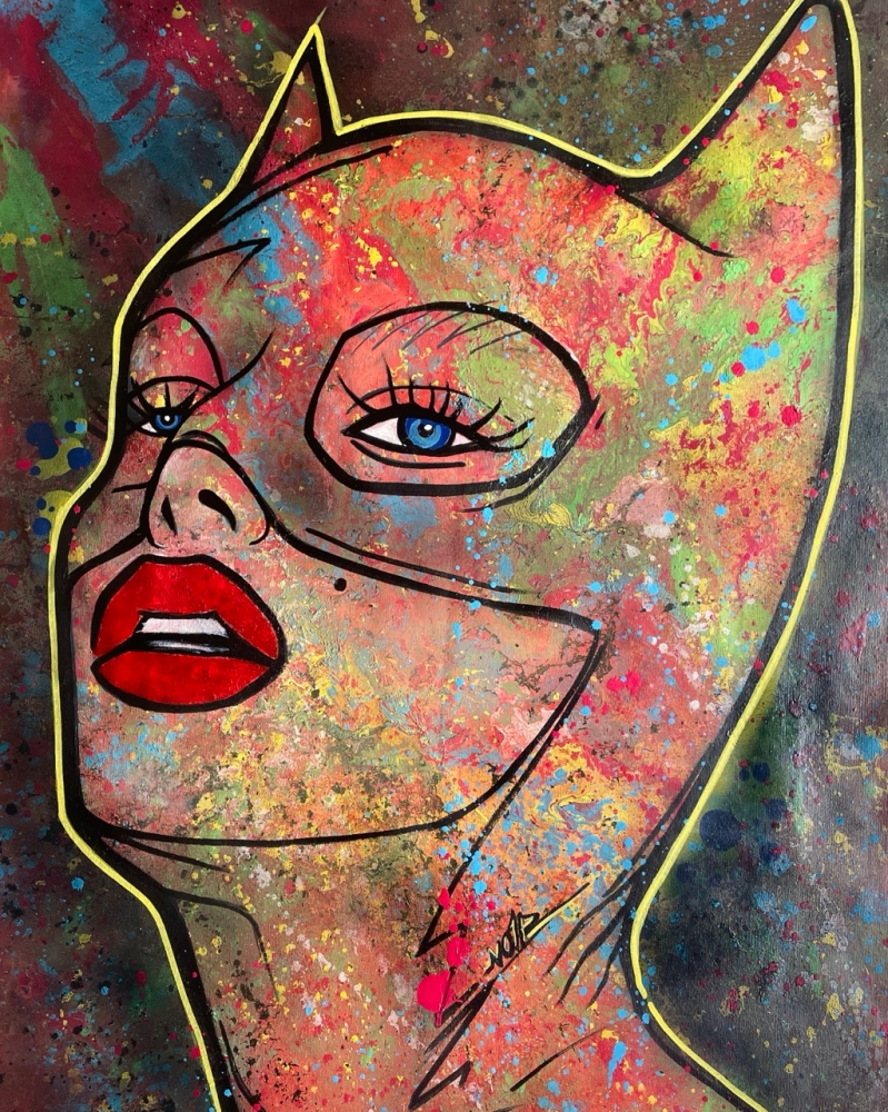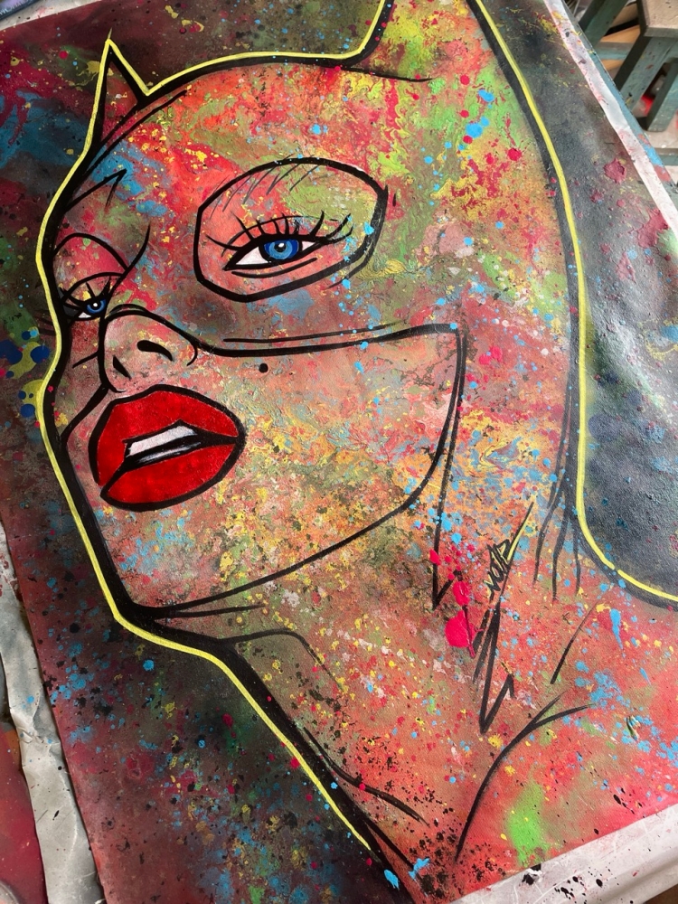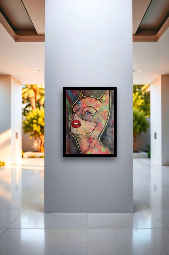 "Catwoman: Wild Textures" An exclusive original by NO1R, this striking Pop Art interpretation of Catwoman emerges through bold abstraction and layered textures. Painted entirely by hand on cotton canvas (80 x 60 cm), the work combines acrylic paint, airbrush, spray paint and mixed media techniques, resulting in a vibrant, dynamic composition where figurative icon meets abstract expression. The background, executed in expressive abstract strokes, contrasts with the iconic figure of Catwoman, creating a visual tension that celebrates both urban energy and pop culture allure. Every layer, splatter and imperfection contributes to the raw authenticity of the piece an unmistakable hallmark of NO1Rs style. Unique original artwork (not a print). Hand-signed by the artist (NO1R). Comes with Certificate of Authenticity. Mixed Media on cotton canvas, 80 x 60 cm. Work will be shipped rolled in a protective tube. Please note: due to the nature of mixed media and spray on canvas, small imperfections, splatters or natural cracks may occur these are intentional and part of the character of the artwork. Colors may vary slightly depending on light conditions during photography. Do not store the artwork in the tube upon arrival. About the Artist NO1R NO1R is a multidisciplinary artist whose practice spans painting, urban art, digital illustration, 3D sculpture and music. Rooted in a strong visual arts background, NO1Rs works explore the intersection of Pop Art, abstraction and urban culture, always marked by a passion for experimentation and texture. Each piece invites the viewer into a universe where imagination, raw expression and iconic imagery converge.