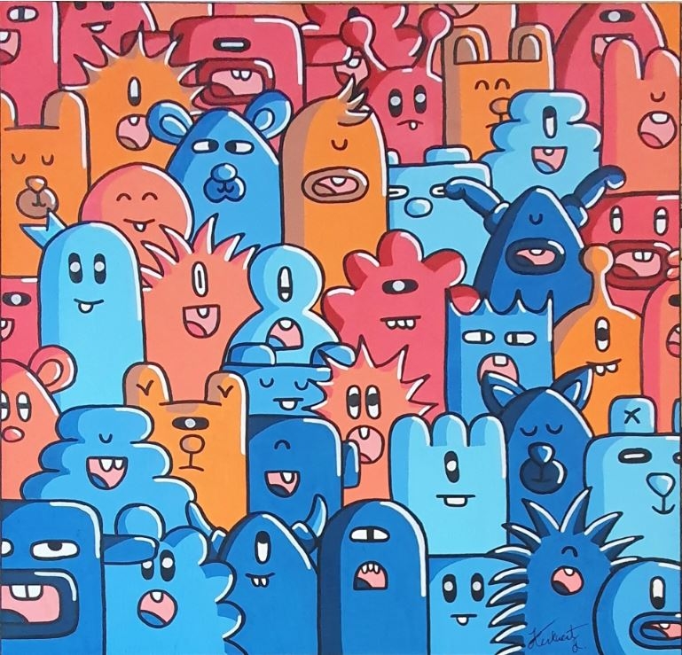 Origineel werk (acrylstift op canvas) van Louise Kerkaert (*2007). 50 x 50 cm. Het werk beeld zuurstofrijke (rode) en zuurstofarme (blauwe) ventjes af. Het werk is ingelijst met zwarte baklijst. Aders visualiseert de stroom van het leven in een netwerk van lijnen en kleuren. Rood en blauw staan tegenover elkaar, symbool voor zuurstofrijk bloed (rood) en zuurstofarm bloed (blauw). Het werk legt de aandacht op het cruciale moment waarop zuurstof wordt opgenomen in de longen, maar evengoed op het moment waarop cellen het zuurstofrijke bloed gebruiken om het leven voort te zetten. Ieder ventje staat symbool voor een rode bloedcel, die op hun manier cruciaal zijn voor het leven. Aders nodigt de kijker uit stil te staan bij de continuïteit en cyclische aard van bestaan: een constante beweging van geven en nemen, een patroon waarin opname en afgifte samen een harmonieus evenwicht vormen.