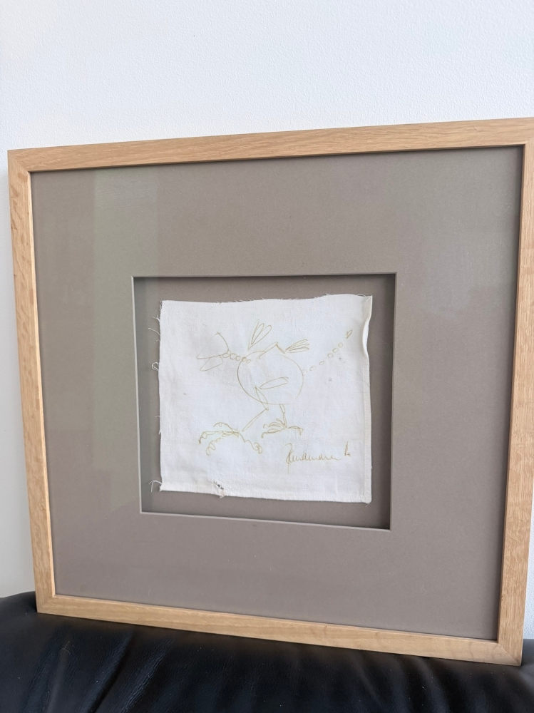 Originele tekening van Panamarenko. Hij maakte dit in een restaurant in Antwerpen op een echte katoenen serviet. Het werk werd ingelijst in een eiken lijst in een verhoogde passe-partout die past bij de inkt van de tekening. Speciaal UV-bestendig glas. origineel werk met gekende herkomst.