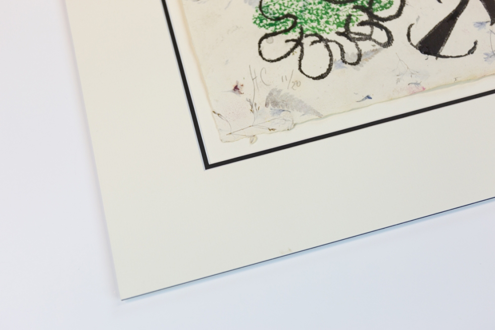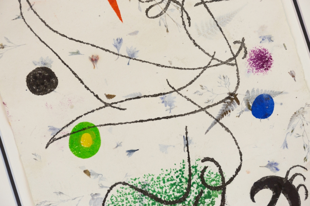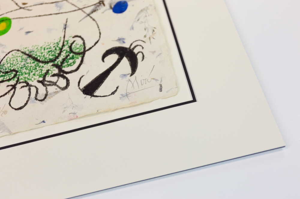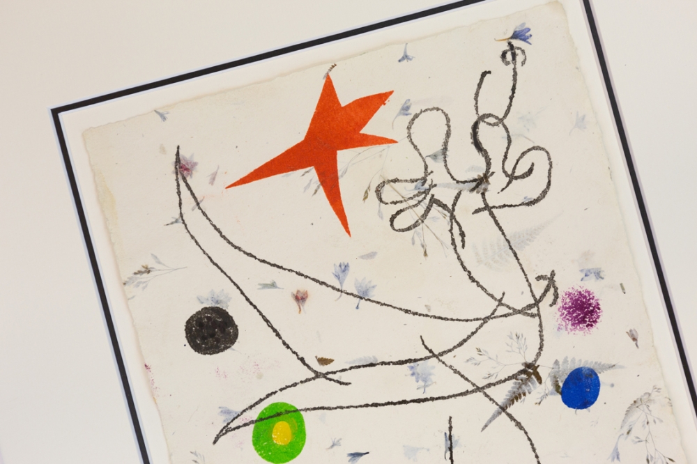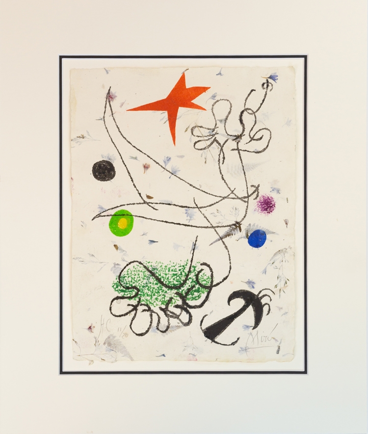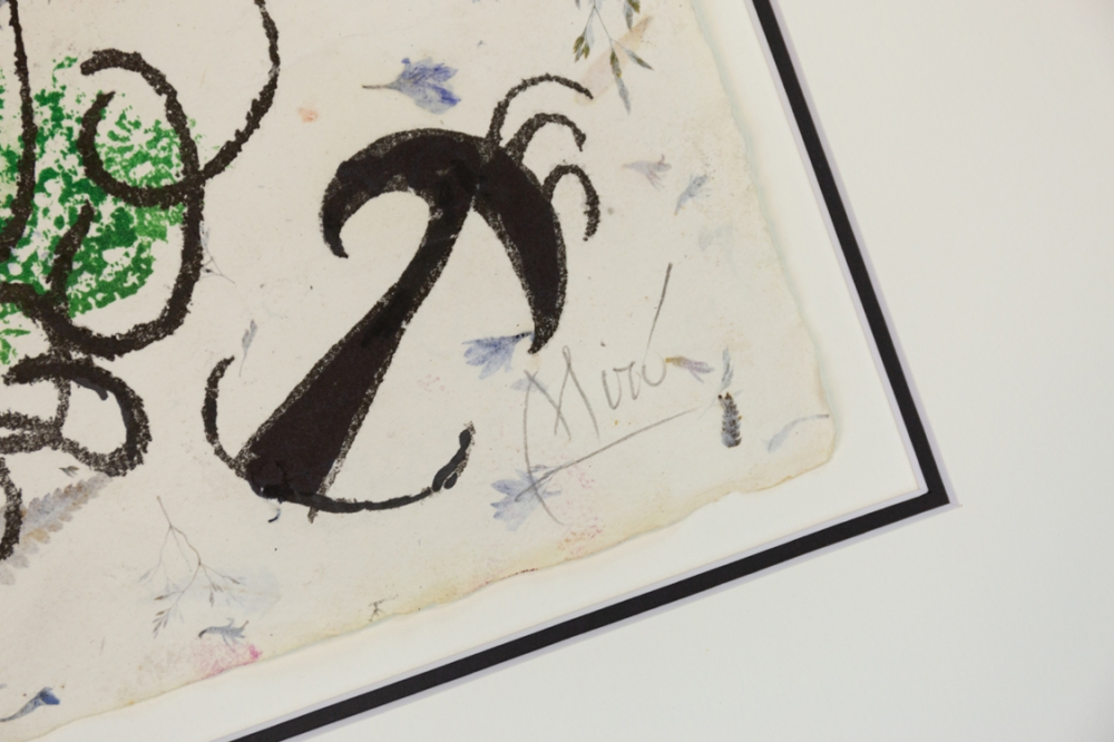Een zeer speciale en zeldzame lithografie op handgemaakt Auvergne, Richard de Bas-papier. Inclusief geperste bloemblaadjes, varenbladuiteinden en grassen. Elk vel is uniek. Gedrukt door Mourlot, Parijs 1960. Uitgegeven voor het album 'Mavena' met poëzie van zijn vriend Radovan Ivsic. Ondertekend in potlood. Nr 11/20 HC. De reguliere editie was 75 indrukken. De uitgevers, Éditions Surréalistes, waren geïnteresseerd in het opnieuw oproepen van de vooroorlogse periode van surrealisme. Toen de willekeurige effecten van de bloemen in het speciaal gecreëerde papier aan Miro werden getoond, ontdekte hij dat ze de elementen van onderbewuste vormcreatie die zijn surrealistische werk uit de jaren dertig hadden doordrenkt wonderbaarlijk opnieuw stimuleerden. Ref: Mourlot 270 (MA202) Cramer 61 Volledig vel 33,5 x 25,5 cm. Mooie indruk met sterke kleuren. In zeer goede staat.