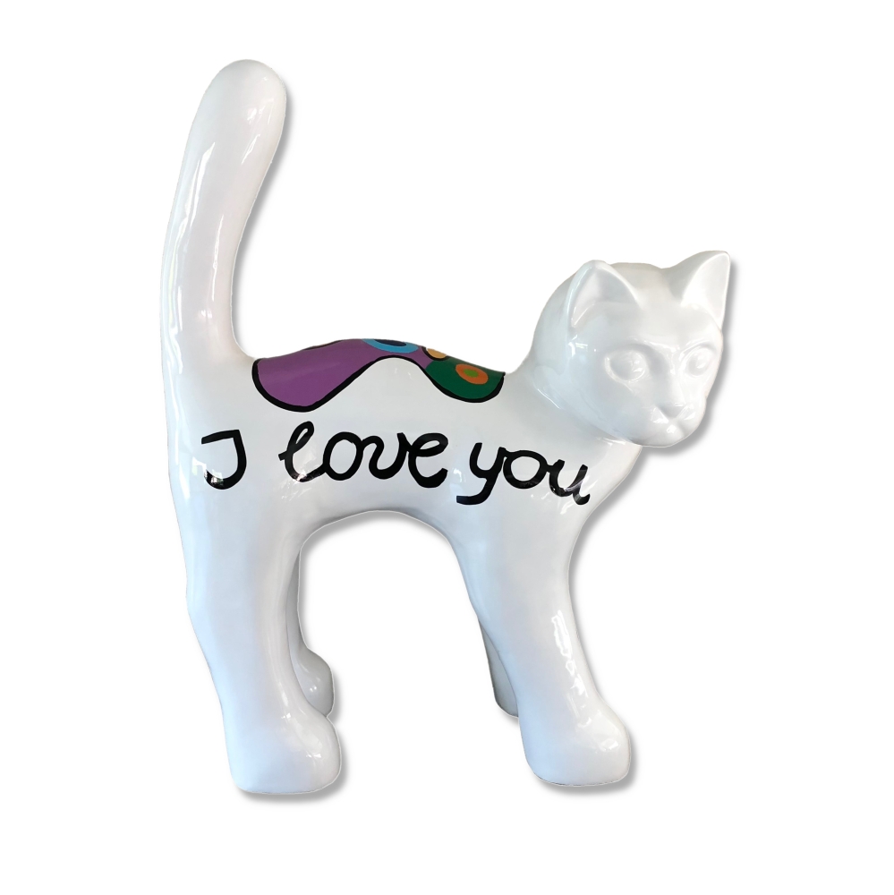 De supersize cat werd uniek met de hand beschilderd door Hannes D'Haese. Nadien afgewerkt met een vernislaag zodat deze waterbestendig is. Met certificaat uitgegeven door de Hannes D'Haese shop. In nieuwstaat. Deze sculptuur vormt steevast de blikvanger van uw tuin of interieur.
