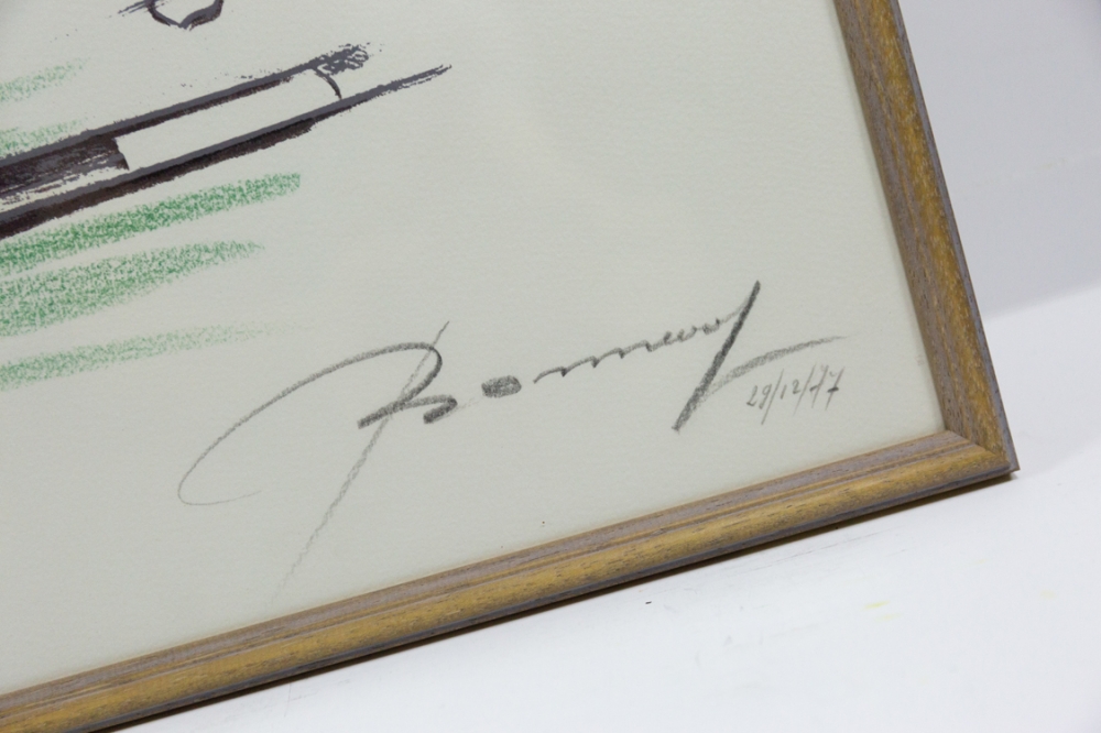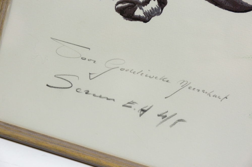 Deze versie van de litho is gedeeltelijk ingekleurd, met de hand gesigneerd en heeft een persoonlijke boodschap: "Voor Godelieve M.". Het werk is ook gedateerd: 29/12/'77