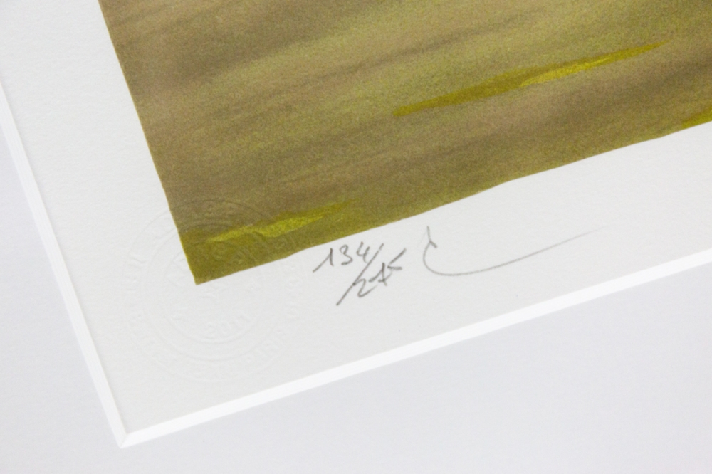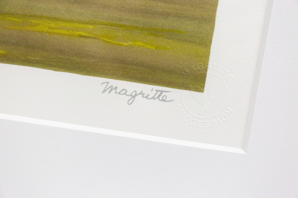 Lithografie getekend en genummerd op 275 exemplaren. De lithografie bevat een stempel van de Fondation Magritte. Het werk is ingelijst in een witte lijst met uv-werend glas en zuurvrije passe-partout. Met echtheidscertificaat. Het werk en de lijst zijn in perfecte staat.