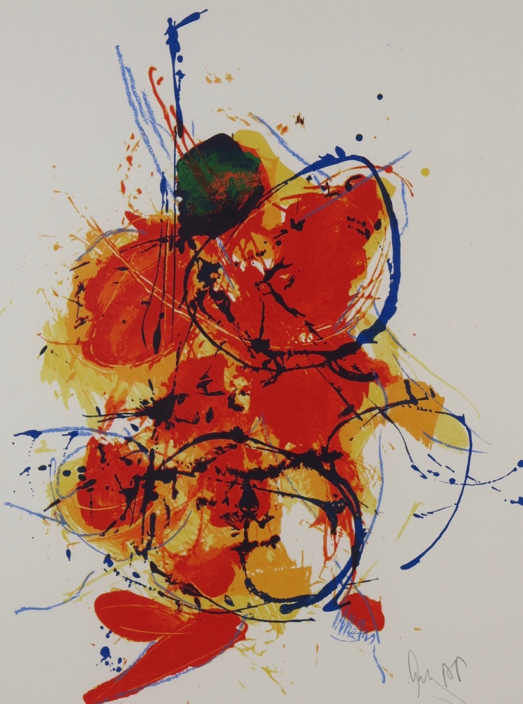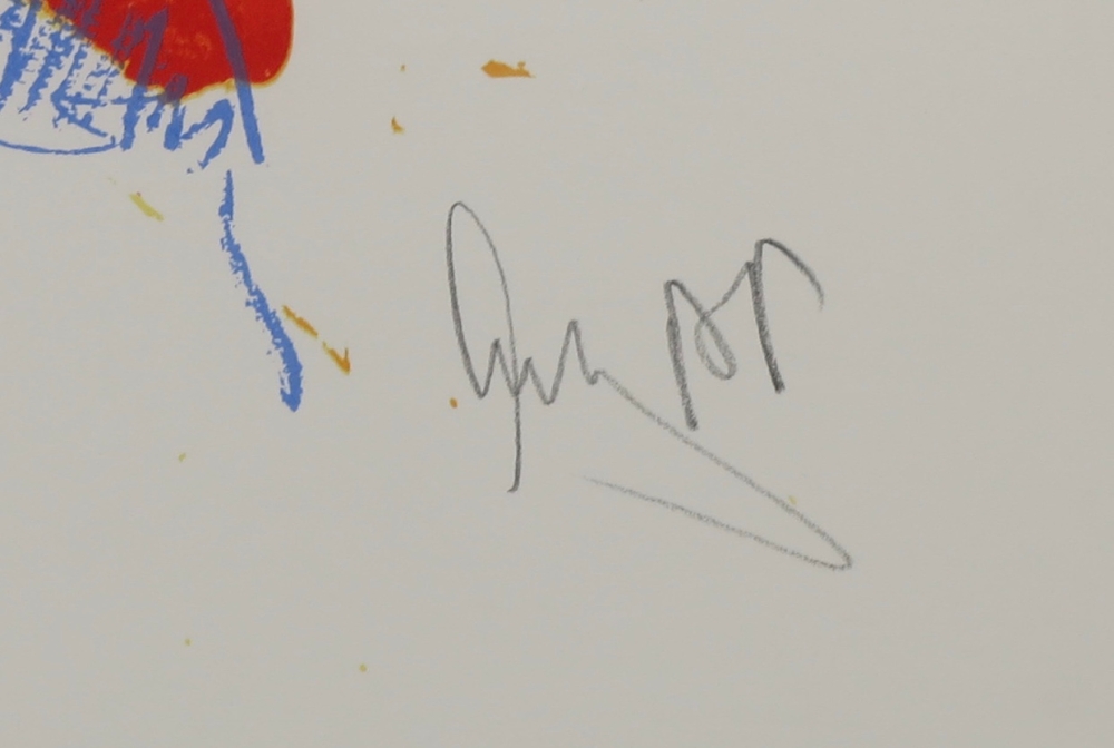 Een zeer mooie en grote lithografie van de kunstenaar Arty Grimm Waarvan dit een A.P. Editie is. Het werk is in perfecte staat en is ook ingelijst. Met de hand gesigneerd en genummerd Het werk is een abstracte composite