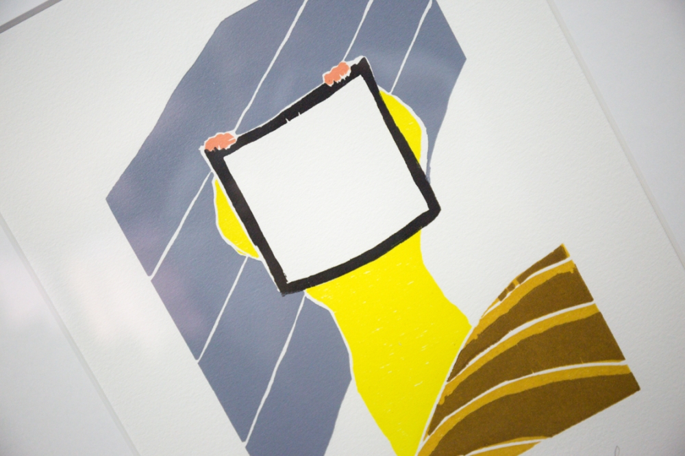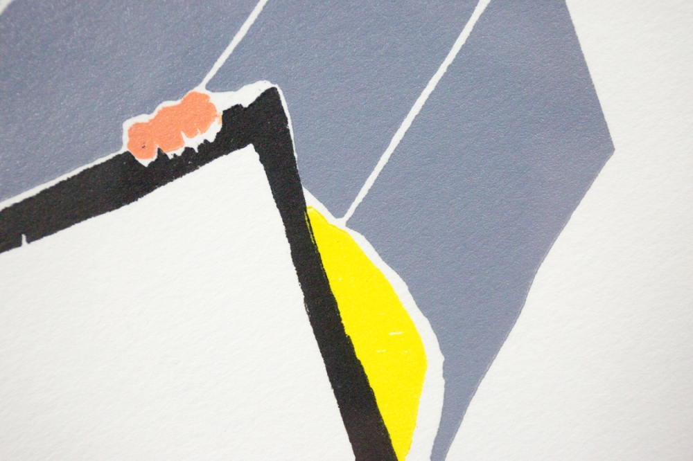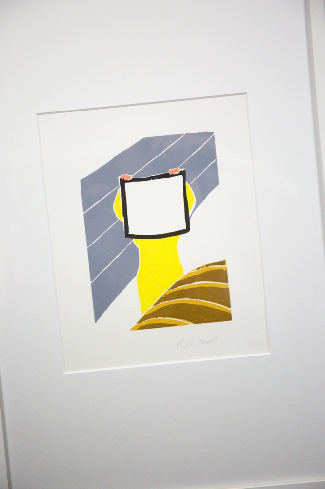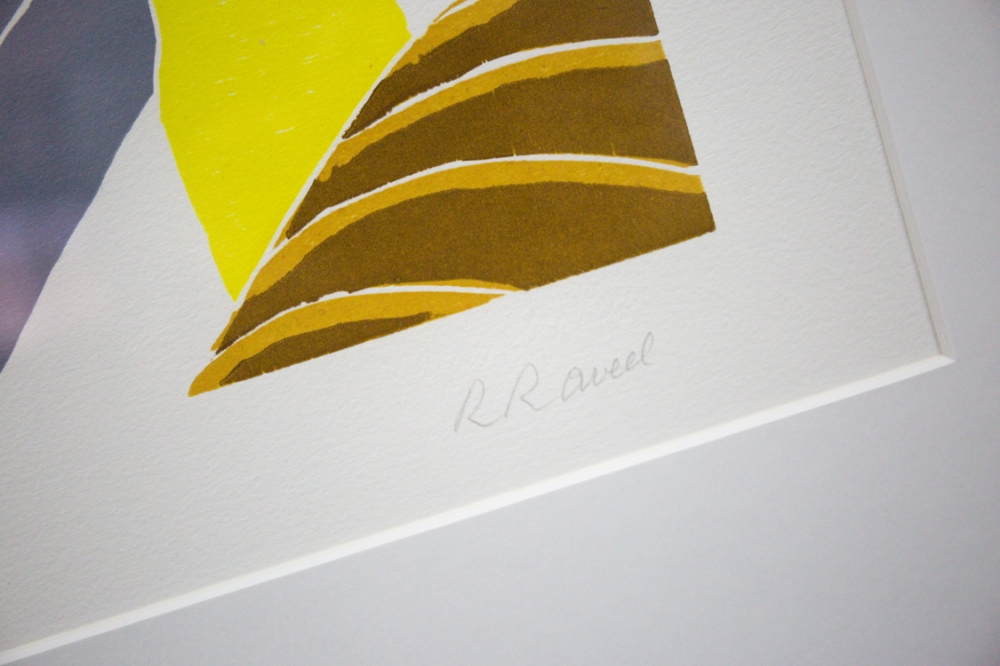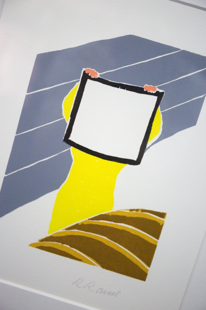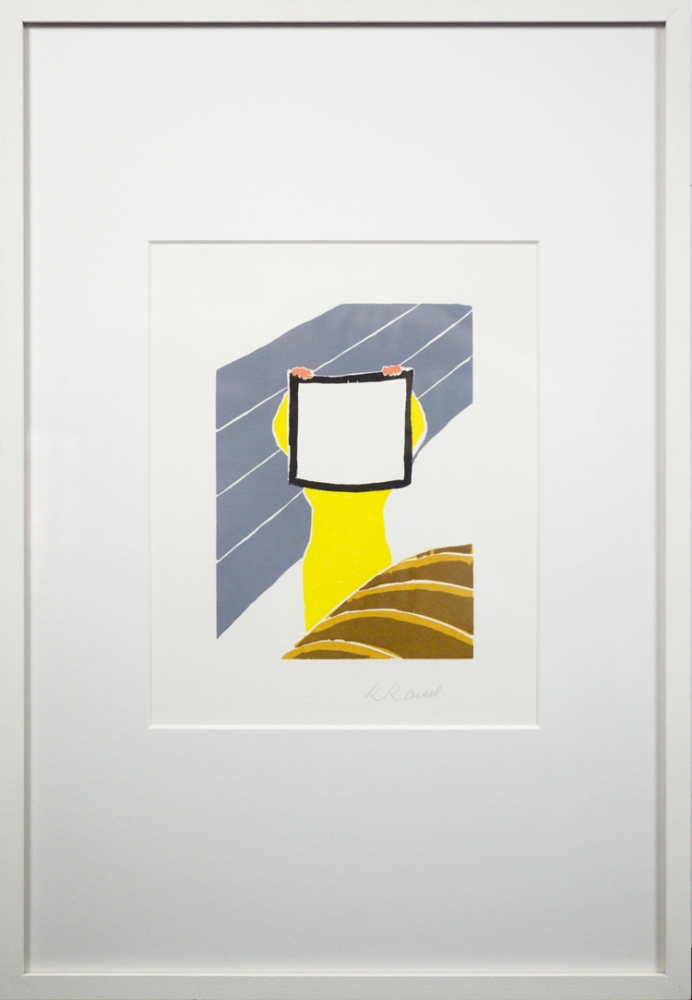 Kleurenhoutsnede van de hand van Roger Raveel. Een mooi stuk, waarop het erg herkenbare witte vierkant dat doorheen Raveels oeuvre vaak terugkomt, centraal aanwezig is.