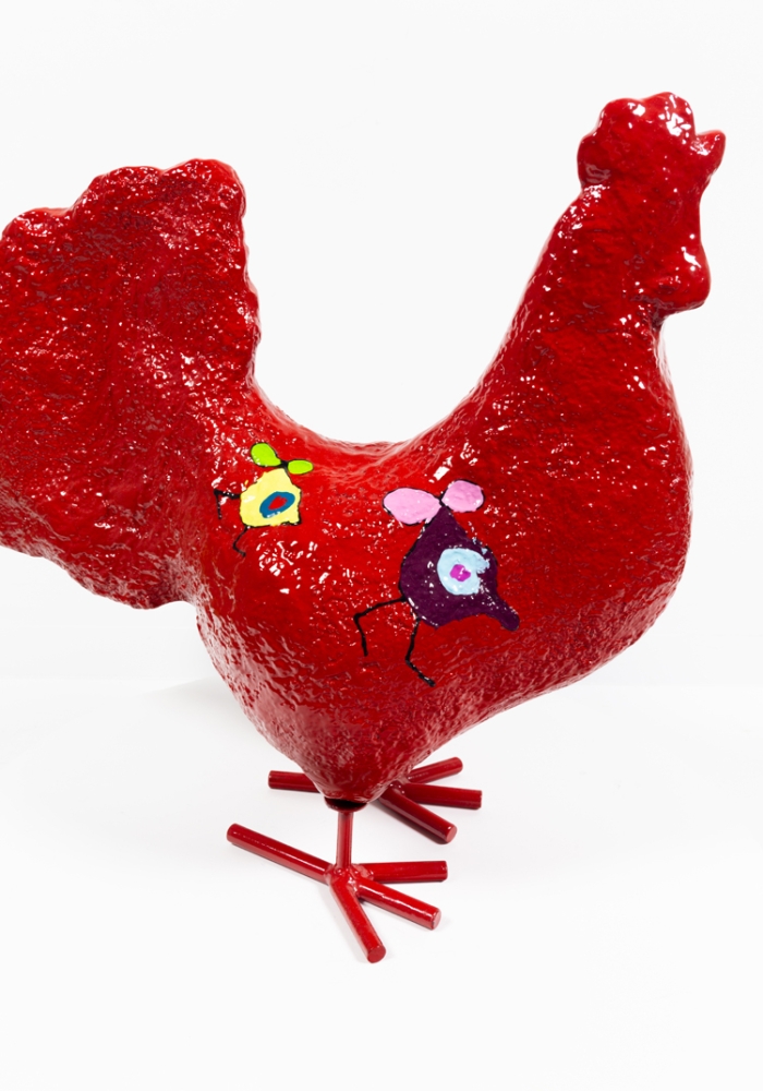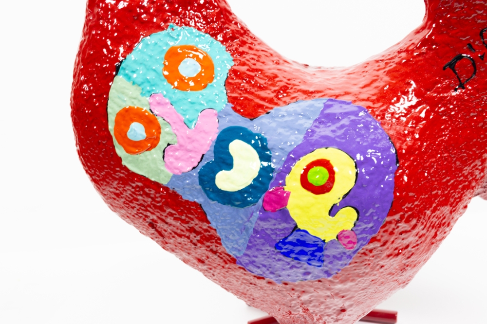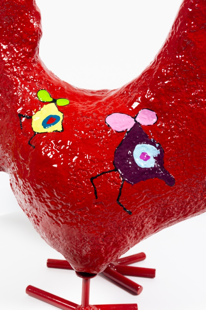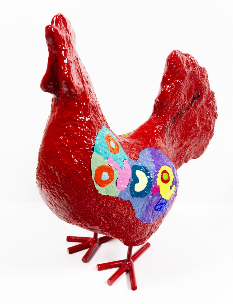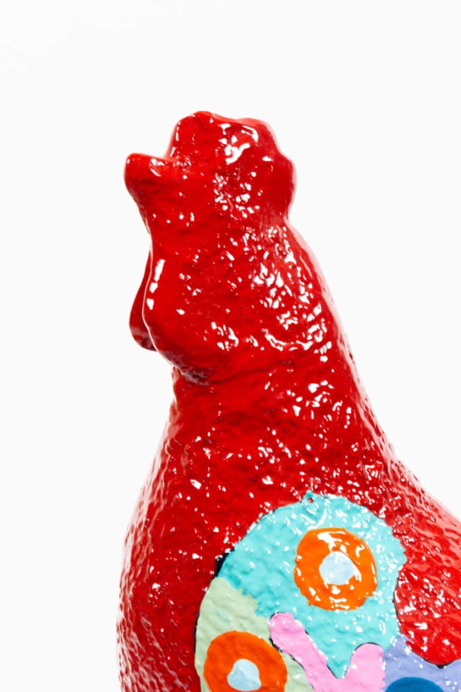 Ietwat abstracter sculptuur van een kip door Hannes D'Haese. Met acrylverf beschilderd op de rug met zijn karakteristieke beschildering. Met de hand gesigneerd.