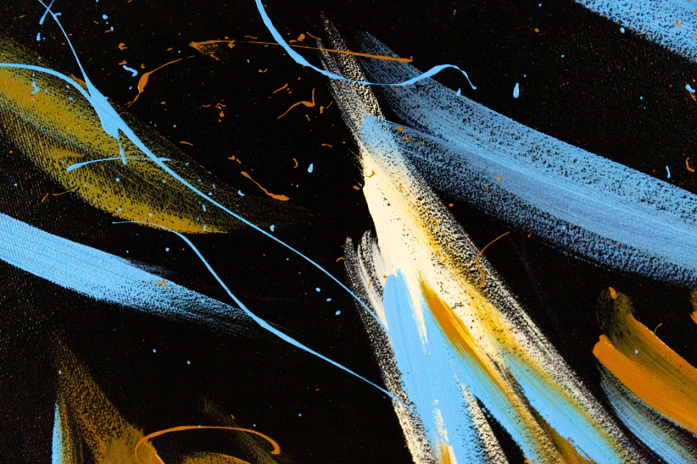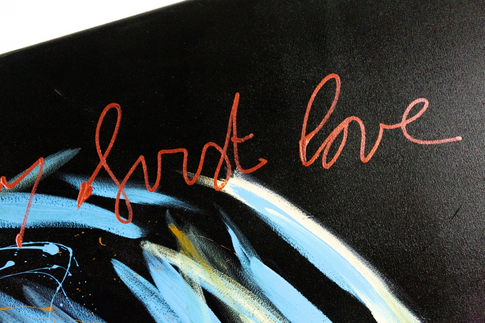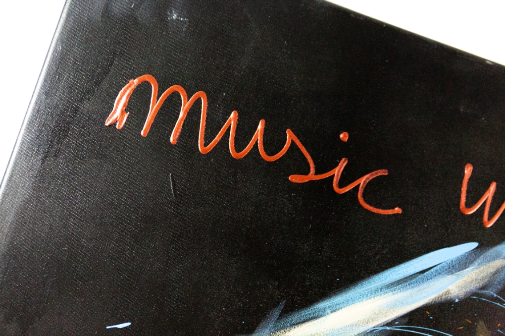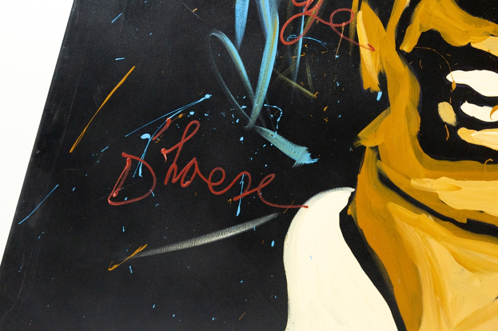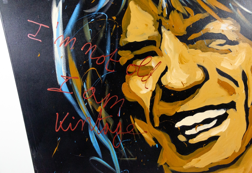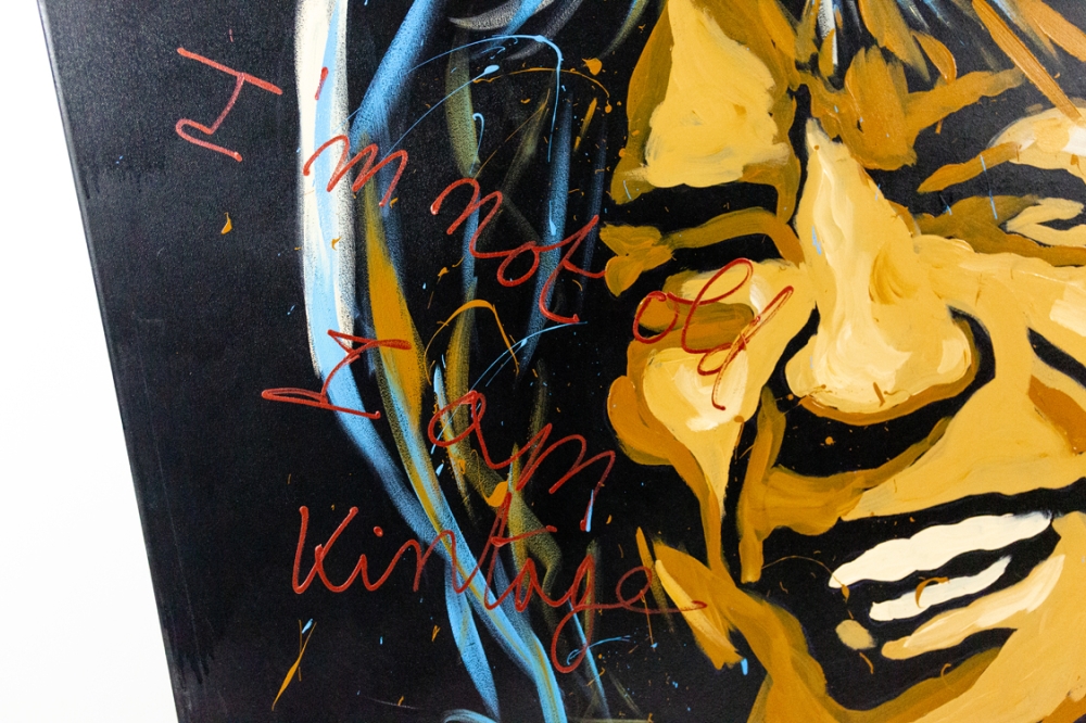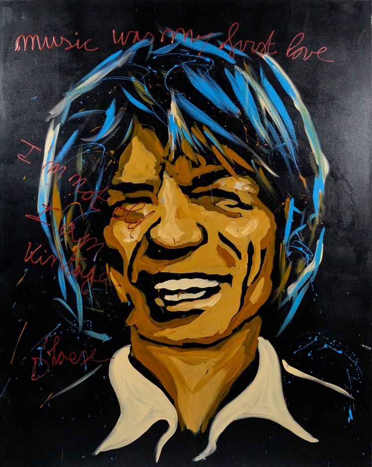 Acrylverfschilderij van een groot fortmaat van Hannes D'Haese met quote "Music was my first love" en "I am not old, I am vintage" een portret van Mick Jagger. Met de hand gesigneerd door Hannes D'Haese.
