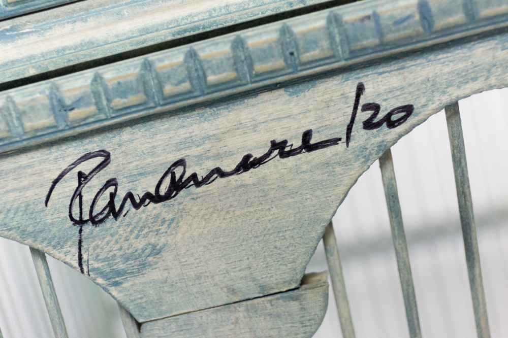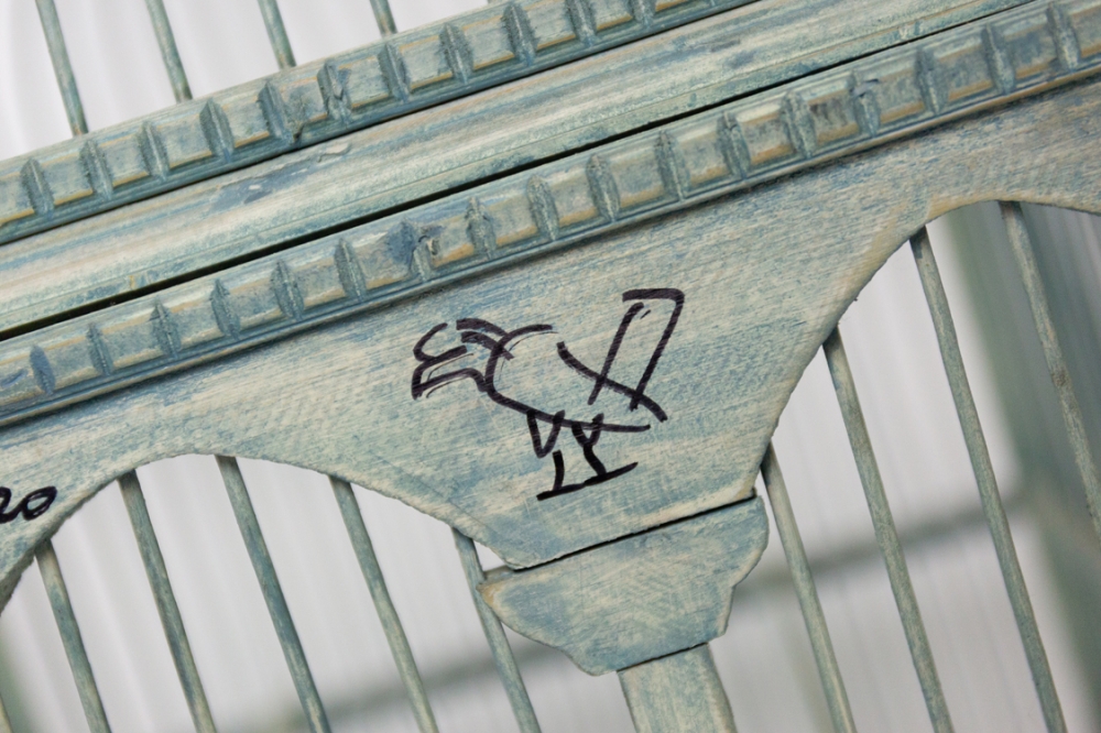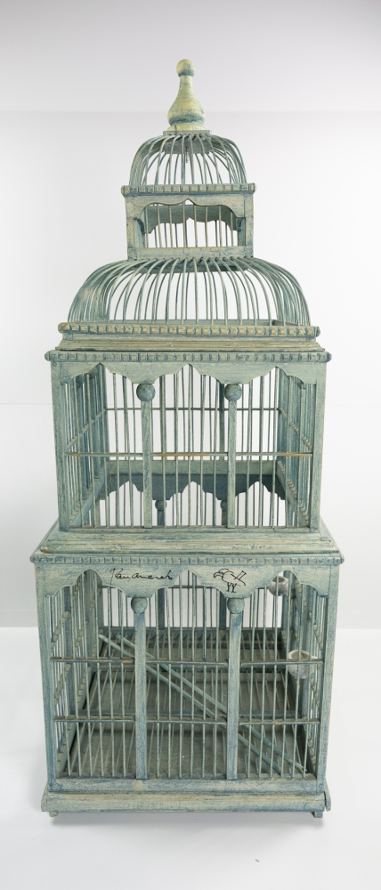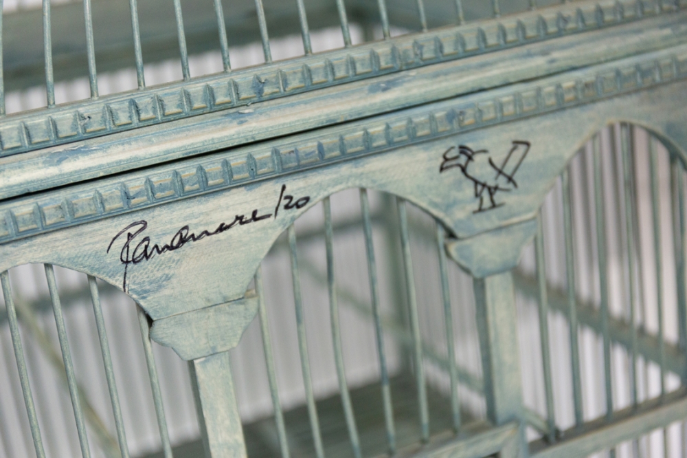 De vogelkooi werd gesigneerd en voorzien van een kleine tekening. De kooi dateert uit 2005, deze werden verkocht (inclusief een vogel) op de vogelmarkt door de marktkramer die gepositioneerd stond voor het huis van Panamarenko. De marktkramer had nog niets verkocht tot Panamarenko hier iets op vond... Panamarenko signeerde de vogelkooien van de marktkramer en in geen tijd was die volledig uitverkocht.
