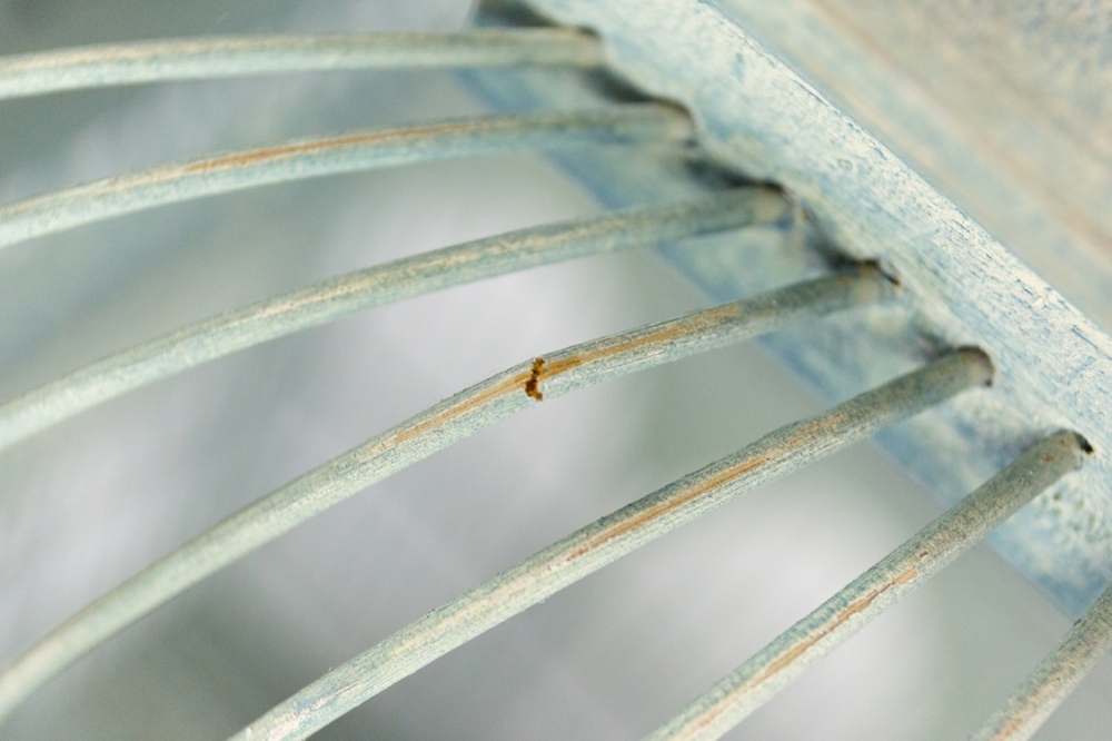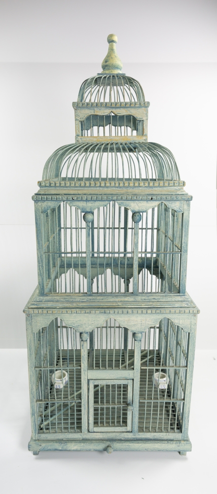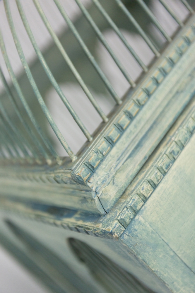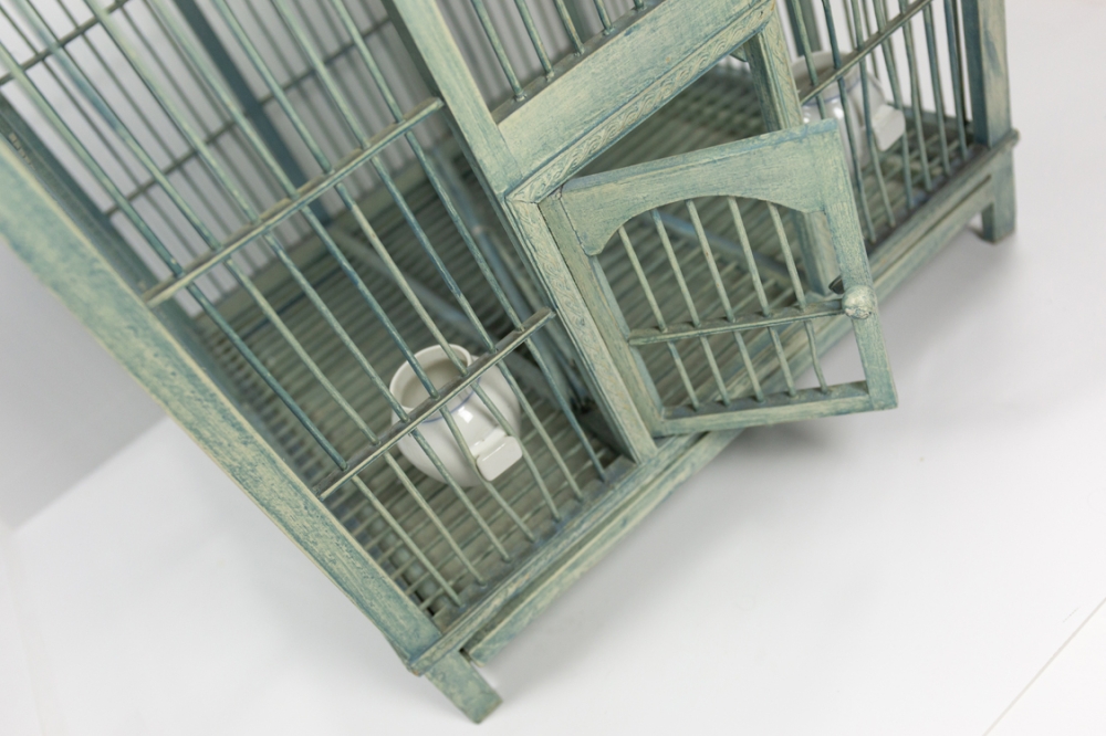 De vogelkooi zelf is een eenvoudige, houten beschilderde constructie. In het 'dak' is één stokje gebroken, aan de voorkant komen een paar kleinere stukjes verf los.