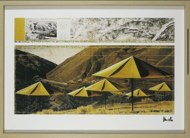 Deze met zwarte stift gesigneerde print is onderdeel van het project The Umbrellas, een tijdelijk kunstwerk dat in twee landen tegelijk werd gerealiseerd om de verschillen en de overeenkomsten uit te lichten van het leven het het gebruik van het land in twee valleien in Japan en in de VS.
