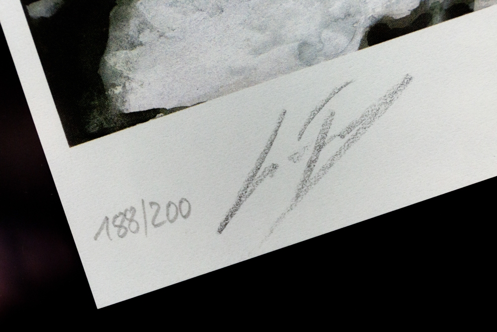 Het werk is ingelijst in zwarte kader met zwarte passe-partout. Het kader is in mindere staat, heeft wel wat onvolkomendheden. Het werk zelf is in uitstekende tot perfecte staat. Het boek heeft lichte gebruikssporen.