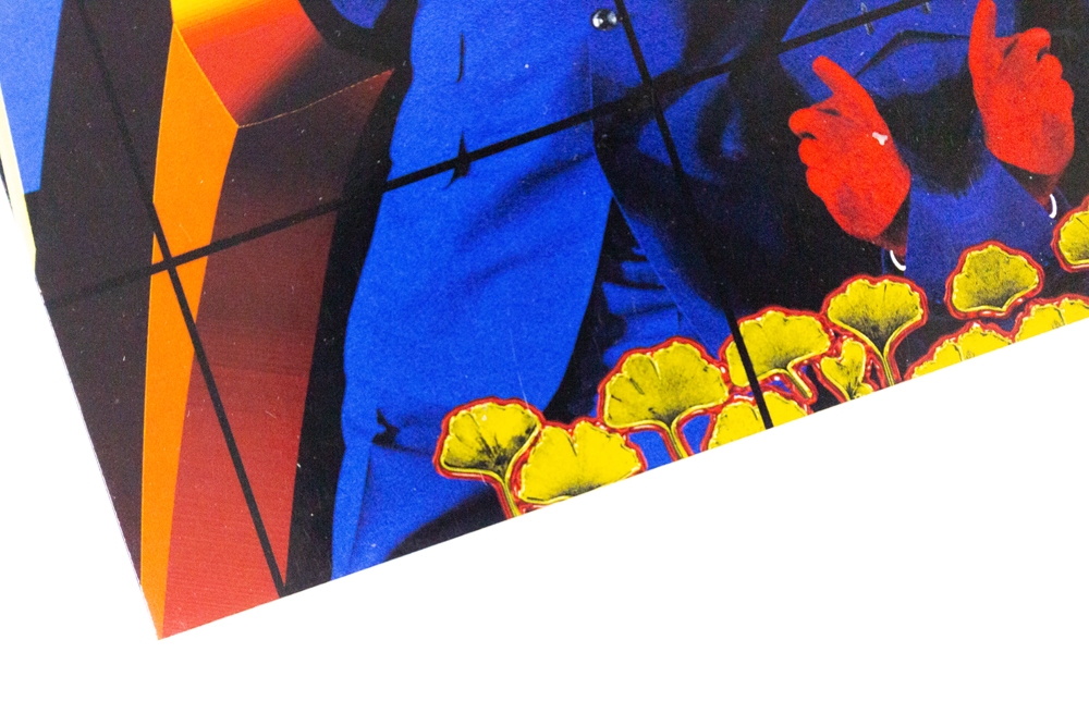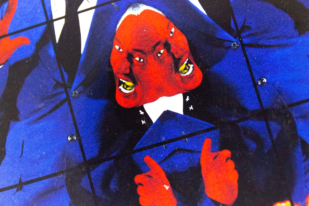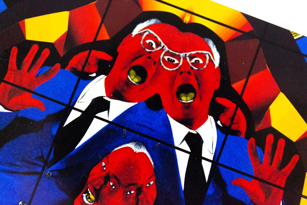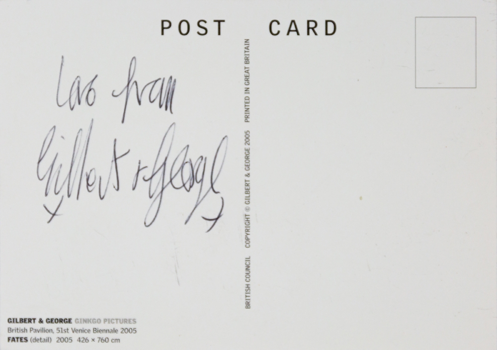 Met de hand gesigneerde postkaart van Gilbert & George, met daarop het werk "Fates" afgebeeld.