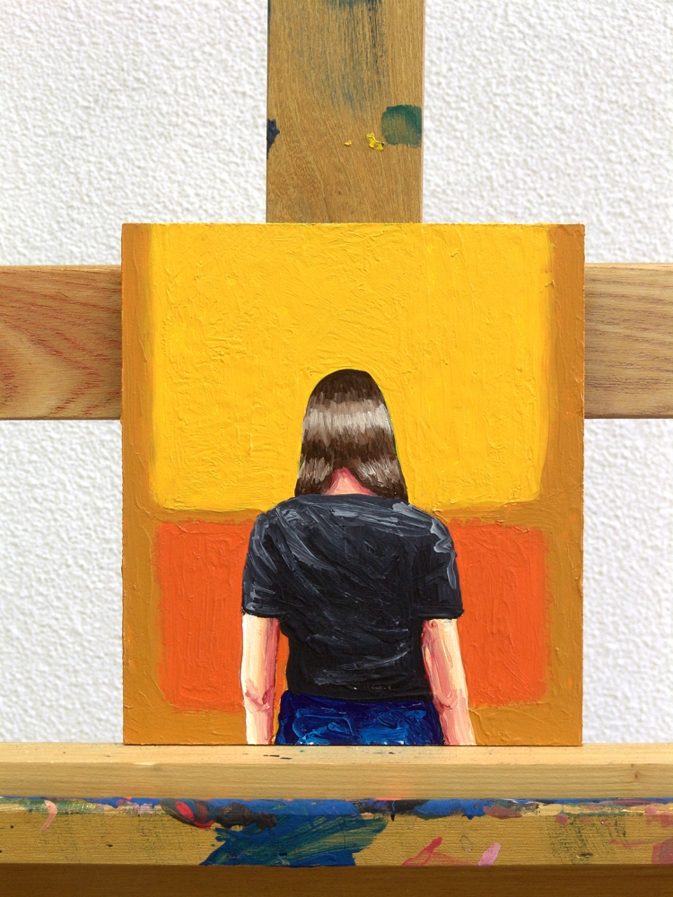 Gerard Boersma staat bekend om zijn schilderijen van mensen die naar bekende schilderijen kijken in musea. Dit werk van 17 x 15 cm toont een vrouw genietend van een schilderij van Mark Rothko. Het werk dateert uit 2020 en is gemaakt met acryl op mdf. Gesigneerd op achterkant. Het schilderij is voorzien van een label van de kunstenaar en wordt geleverd met certificaat van echtheid. Over de kunstenaar: Gerard Boersma werkt al 19 jaar als international schilder en is bekend om zijn eigen stijl van realistisch schilderen. Zijn schilderijen worden wereldwijd verzameld (6 continenten, 30 landen). In 2018 toonde hij zijn werk samen met Warhol, Haring, Banksy en anderen op een groepstentoonstelling bij zijn galerie in Frankrijk. Hij woont en werkt in Leeuwarden, Nederland.
